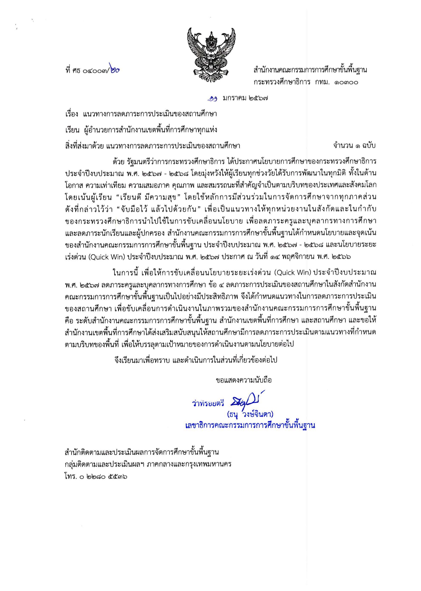 ในการนี้ เพื่อให้การขับเคลื่อนนโยบายระยะเร่งด่วน (Quick Win) ประจำปีงบประมาณ พ.ศ.๒๕๖๗ ลดภาระครูและบุคลากรทางการศึกษา ข้อ ๔ ลดภาระการประเมินของสถานศึกษาในสังกัดสำนักงานคณะกรรมการการศึกษาขั้นพื้นฐานเป็นไปอย่างมีประสิทธิภาพ จึงได้กำหนดแนวทางในการลดภาระการประเมินของสถานศึกษา เพื่อขับเคลื่อนการดำเนินงานในภาพรวมของสำนักงานคณะกรรมการการศึกษาขั้นพื้นฐาน คือ ระดับสำนักงานคณะกรรมการการศึกษาขั้นพื้นฐาน สำนักงานเขตพื้นที่การศึกษา และสถานศึกษา และขอให้ สำนักงานเขตพื้นที่การศึกษาได้ส่งเสริมสนับสนุนให้สถานศึกษา มีการลดภาระการประเมิน ตามแนวทางที่กำหนด ตามบริบทของพื้นที่เพื่อให้บรรลุตามเป้าหมายของการดำเนินงานตามนโยบายต่อไป
