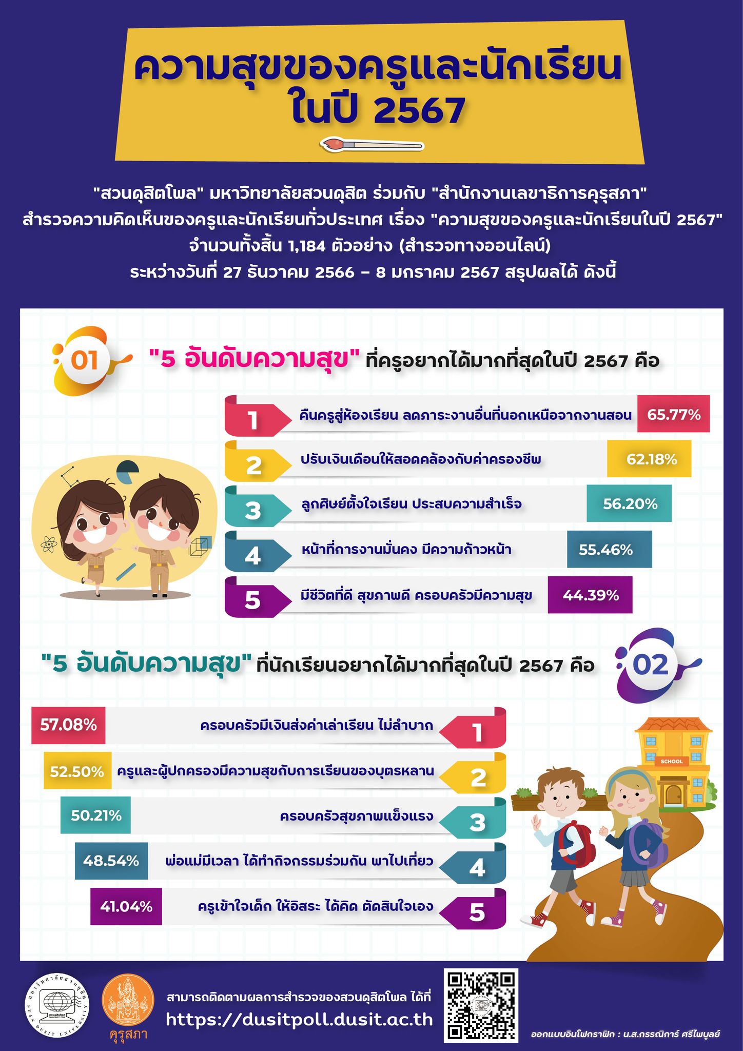 ความสุขของครูและนักเรียนในปี 2567 สวนดุสิตโพล มหาวิทยาลัยสวนดุสิต ร่วมกับ “สำนักงานเลขาธิการคุรุสภา” สำรวจความคิดเห็นของครูและ นักเรียนทั่วประเทศ เรื่อง “ความสุขของครูและนักเรียนในปี 2567” จำนวนทั้งสิ้น 1,184 ตัวอย่าง (สำรวจทาง ออนไลน์) ระหว่างวันที่ 27 ธันวาคม 2566 – 8 มกราคม 2567 สรุปผลได้ ดังนี้