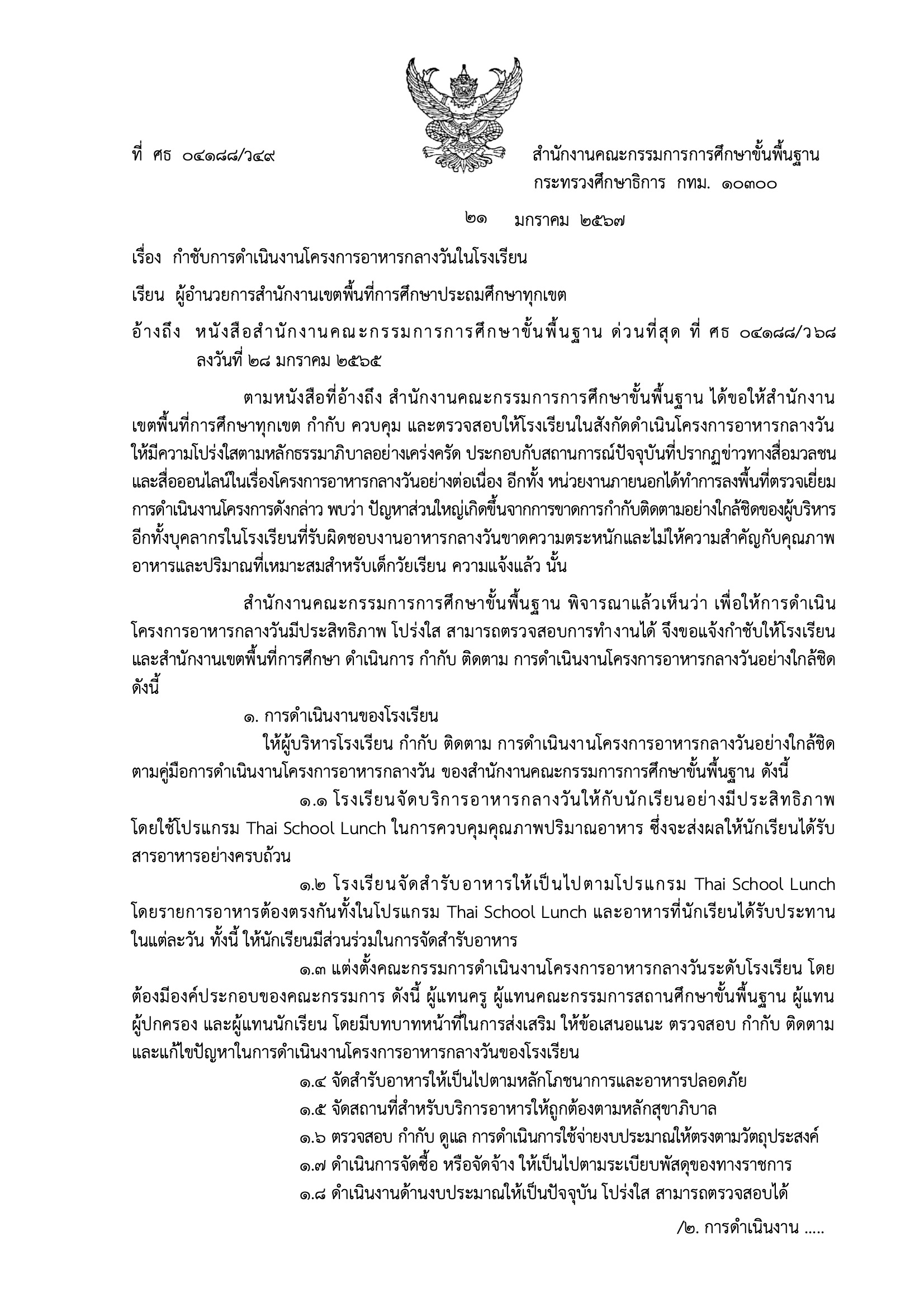 สำนักงานคณะกรรมการการศึกษาขั้นพื้นฐาน มีหนังสือ ศธ 04188/ว49 ลงวันที่ 21 มกราคม 2567 เรื่อง กำชับการดำเนินงานโครงการอาหารกลางวันในโรงเรียน