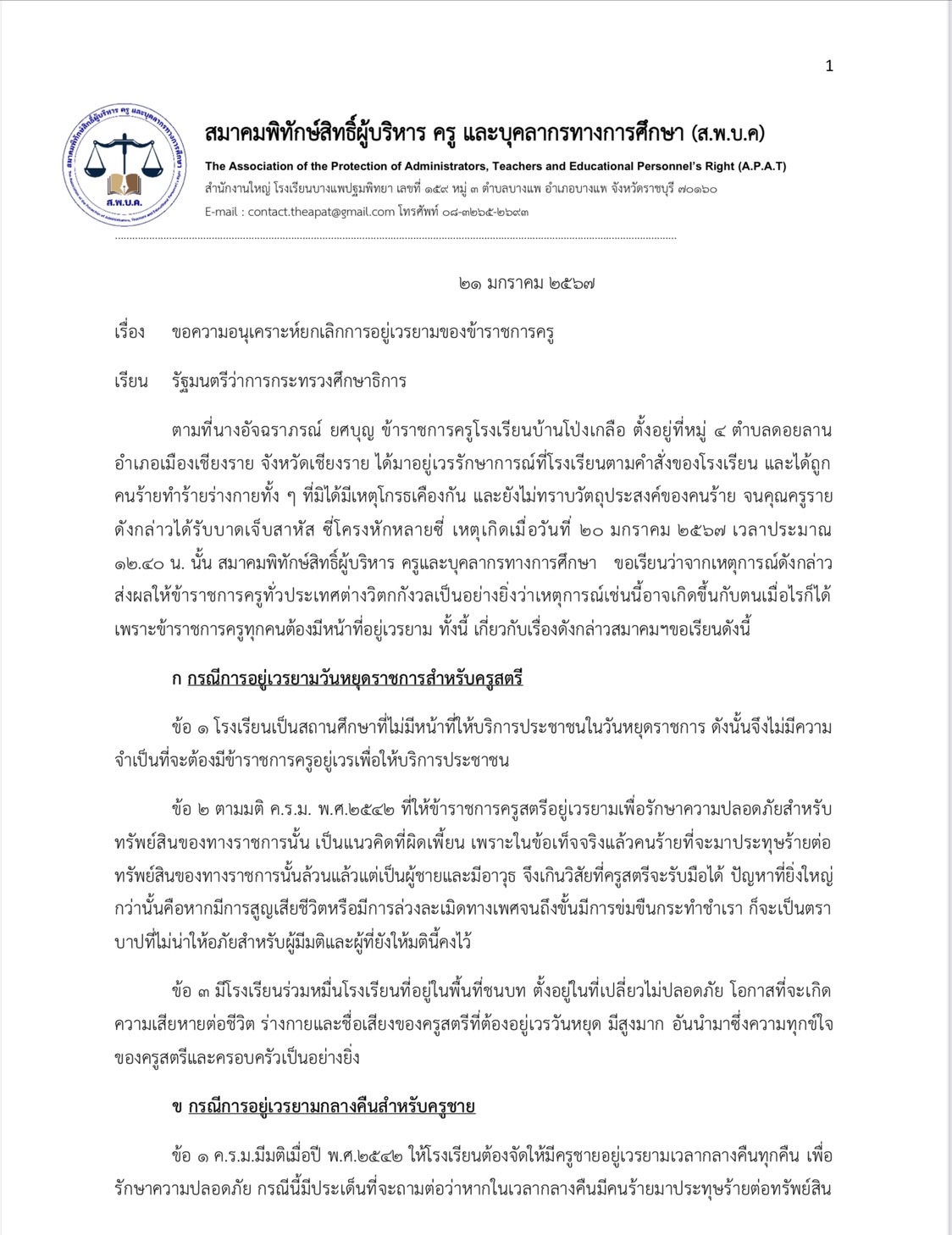 ตามที่นางอัจฉราภรณ์ ยศบุญ ข้าราชการครูโรงเรียนบ้านโป่งเกลือ ตั้งอยู่ที่หมู่ ๔ ตำบลดอยลาน อำเภอเมืองเชียงราย จังหวัดเชียงราย ได้มาอยู่เวรรักษาการณ์ที่โรงเรียนตามคำสั่งของโรงเรียน และได้ถูกคนร้ายทำร้ายร่างกายทั้ง ๆ ที่มิได้มีเหตุโกรธเคืองกัน และยังไม่ทราบวัตถุประสงค์ของคนร้าย จนคุณครูรายดังกล่าวได้รับบาดเจ็บสาหัส ซี่โครงหักหลายซี่ เหตุเกิดเมื่อวันที่ ๒๐ มกราคม ๒๕๖๗ เวลาประมาณ ๑๒.๔๐ น. นั้น สมาคมพิทักษ์สิทธิ์ผู้บริหาร ครูและบุคลากรทางการศึกษา ขอเรียนว่าจากเหตุการณ์ดังกล่าวส่งผลให้ข้าราชการครูทั่วประเทศต่างวิตกกังวลเป็นอย่างยิ่งว่าเหตุการณ์เช่นนี้อาจเกิดขึ้นกับตนเมื่อไรก็ได้เพราะข้าราชการครูทุกคนต้องมีหน้าที่อยู่เวรยาม ทั้งนี้ เกี่ยวกับเรื่องดังกล่าวสมาคมฯขอเรียนดังนี้