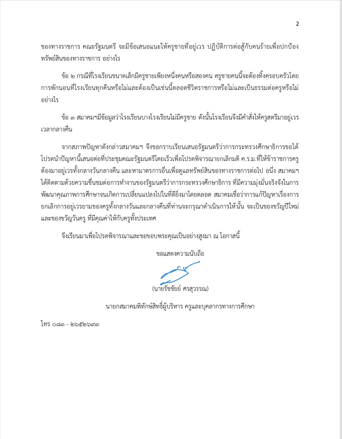 อนึ่ง สมาคมฯได้ติดตามด้วยความชื่นชมต่อการทำงานของรัฐมนตรีว่าการกระทรวงศึกษาธิการ ที่มีความมุ่งมั่นจริงจังในการพัฒนาคุณภาพการศึกษาจนเกิดการเปลี่ยนแปลงไปในที่ดียิ่งมาโดยตลอด สมาคมเชื่อว่าการแก้ปัญหาเรื่องการยกเลิกการอยู่เวรยามของครูทั้งกลางวันและกลางคืนที่ท่านจะกรุณาดำเนินการให้นั้น จะเป็นของขวัญปีใหม่และของขวัญวันครู ที่มีคุณค่าให้กับครูทั้งประเทศ