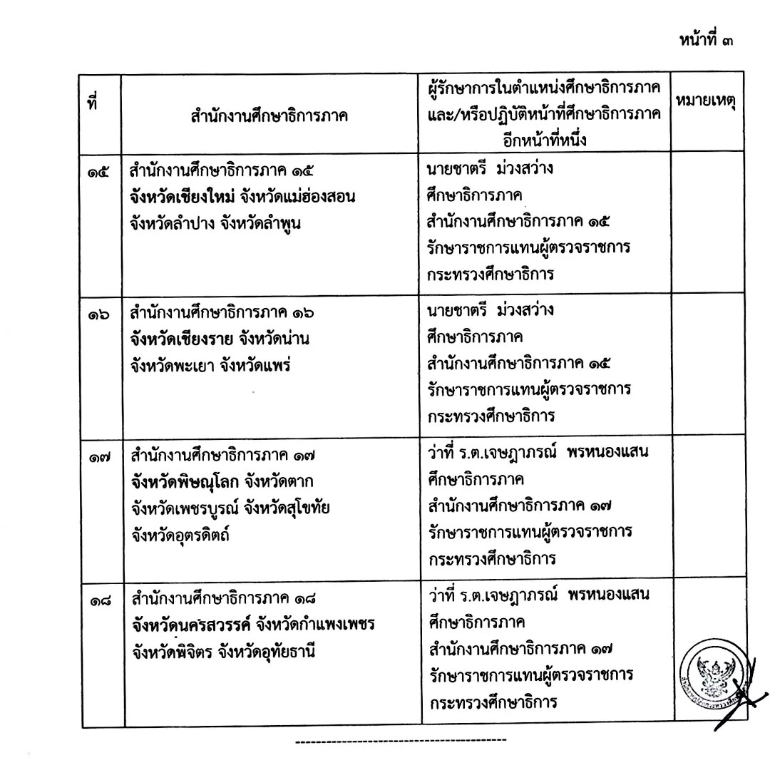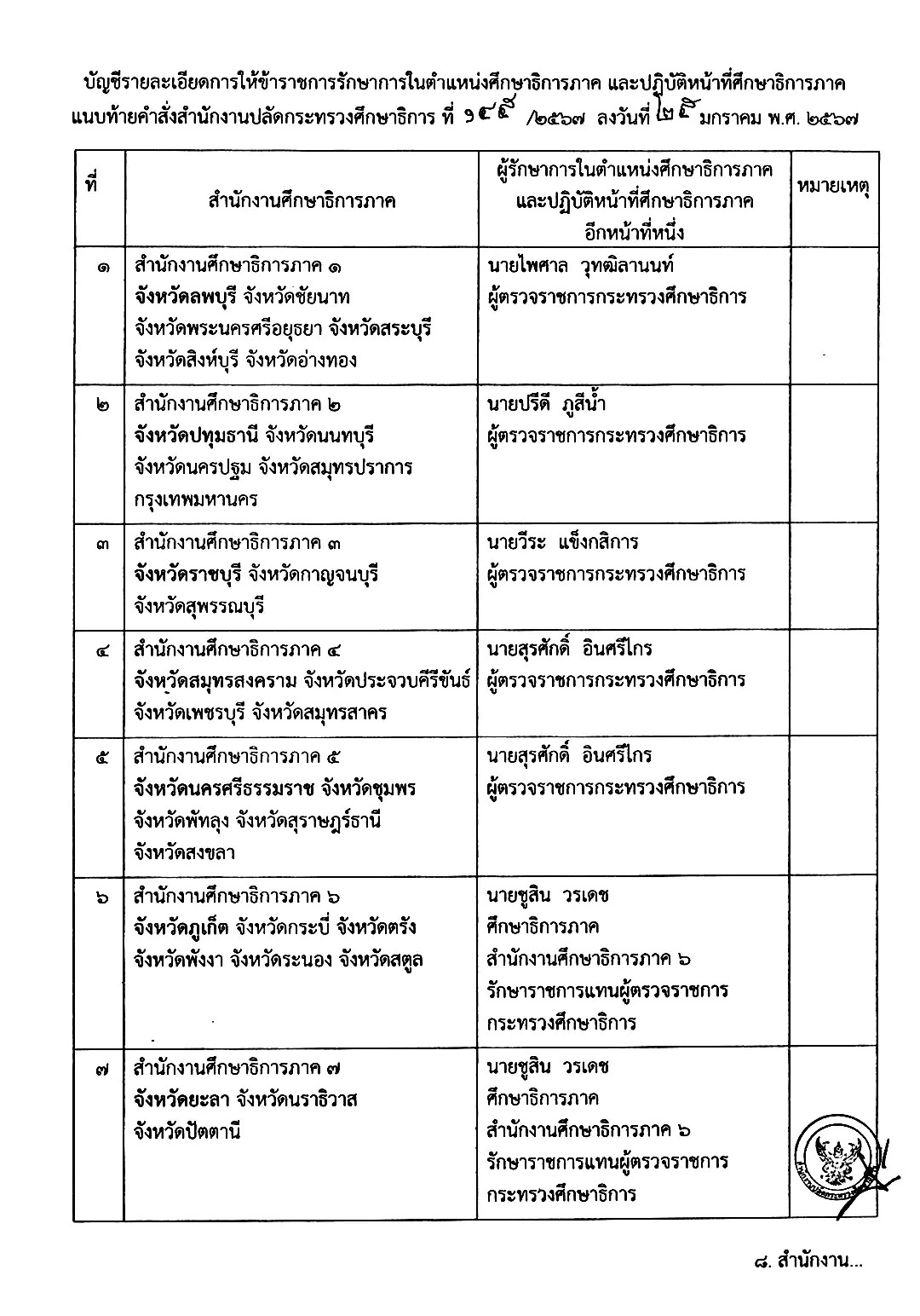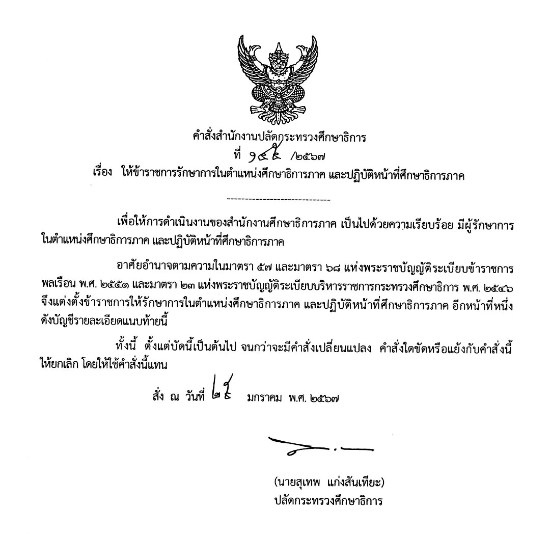 นายสุเทพ แก่งสันเทียะ ปลัดกระทรวงศึกษาธิการ ลงนามในคำสั่งสำนักงานปลัดกระทรวงศึกษาธิการ ที่ 145/2567 สั่ง ณ วันที่ 25 มกราคม พ.ศ. 2567 เรื่อง ให้ข้าราชการรักษาการในตำแหน่งศึกษาธิการภาค และปฏิบัติหน้าที่ศึกษาธิการภาค ทั้ง 18 แห่ง โดยมีรายละเอียด ดังนี้