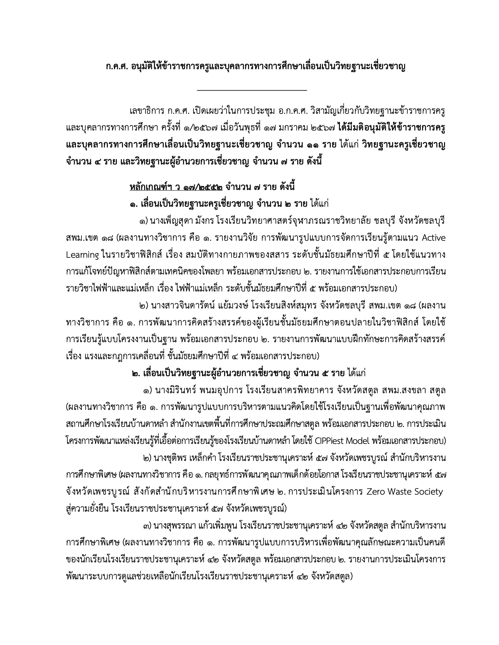 ก.ค.ศ. อนุมัติให้ข้าราชการครูและบุคลากรทางการศึกษาเลื่อนเป็นวิทยฐานะเชี่ยวชาญ จำนวน 11 ราย เมื่อวันที่ 17 มกราคม 2567