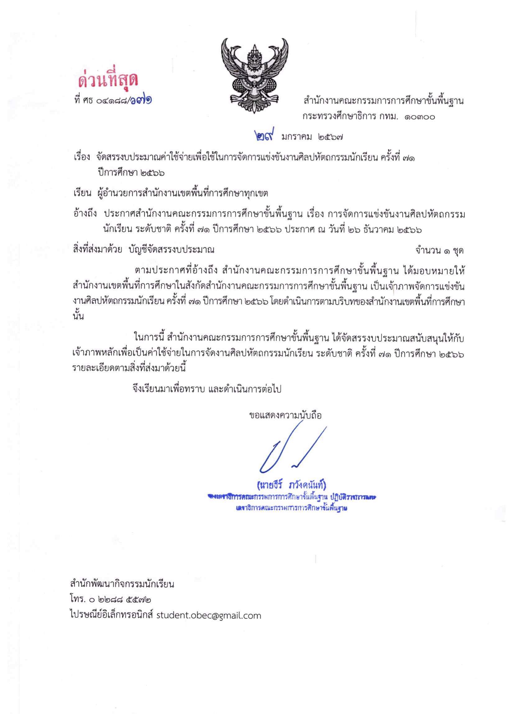 สำนักงานคณะกรรมการการศึกษาขั้นพื้นฐาน มีหนังสือที่ ศธ 04188/ว71 ลงวันที่ : 29 มค 2567 เรื่อง จัดสรรงบประมาณค่าใช้จ่ายเพื่อใช้ในการจัดการแข่งขันงานศิลปหัตถกรรมนักเรียน ครั้งที่ 71 ปีการศึกษา 2566 รายละเอียด ดังนี้