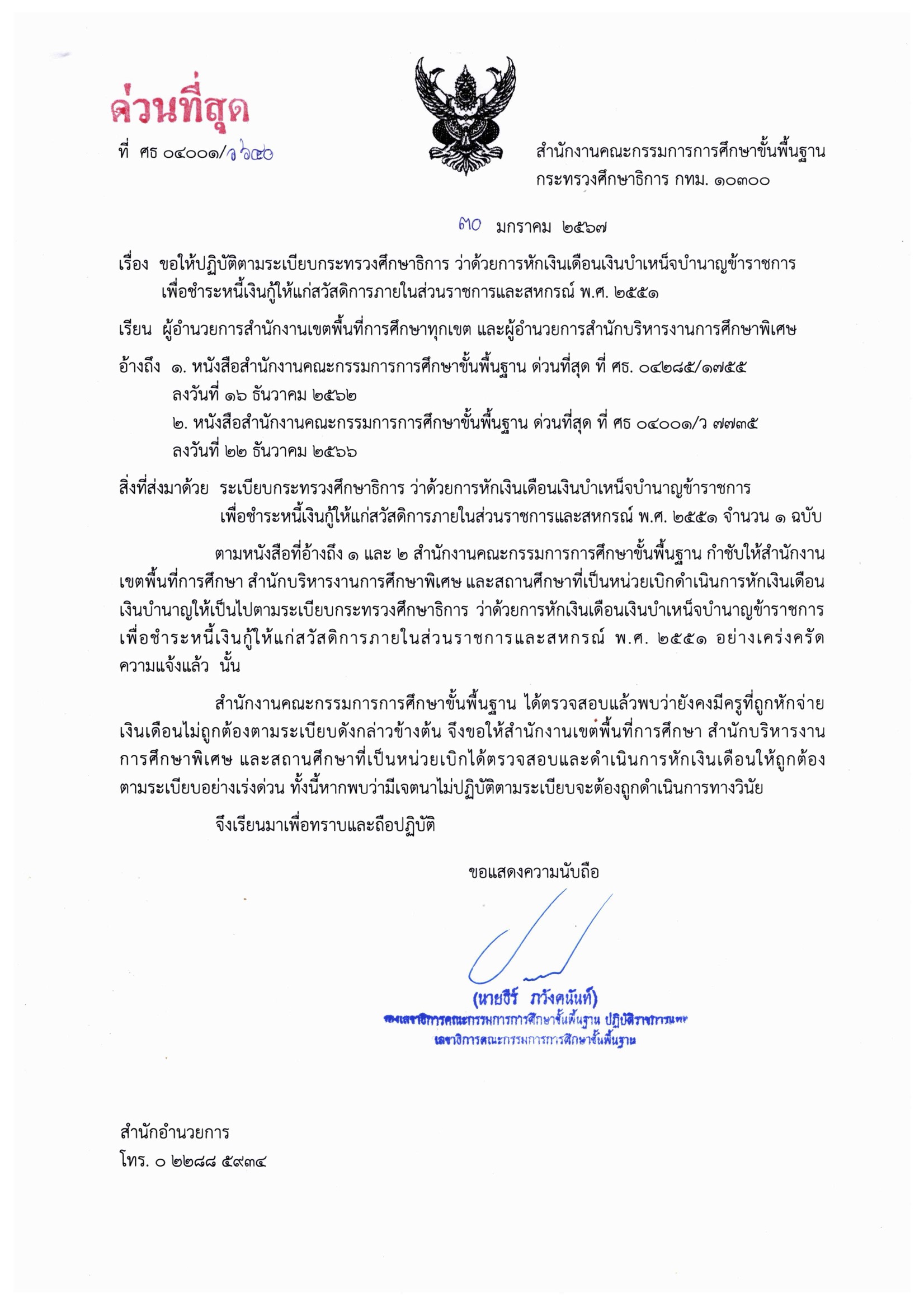 สำนักงานคณะกรรมการการศึกษาขั้นพื้นฐาน มีหนังสือ ด่วนที่สุด ที่ ศธ 04001/ว640 ลงวันที่ 31 มกราคม 2567 เรื่อง ขอให้ปฏิบัติตามระเบียบกระทรวงศึกษาธิการ ว่าด้วยการหักเงินเดือนเงินบำเหน็จบำนาญข้าราชการ เพื่อชำระหนี้เงินกู้ให้แก่สวัสดิการภายในส่วนราชการและสหกรณ์ พ.ศ.2551