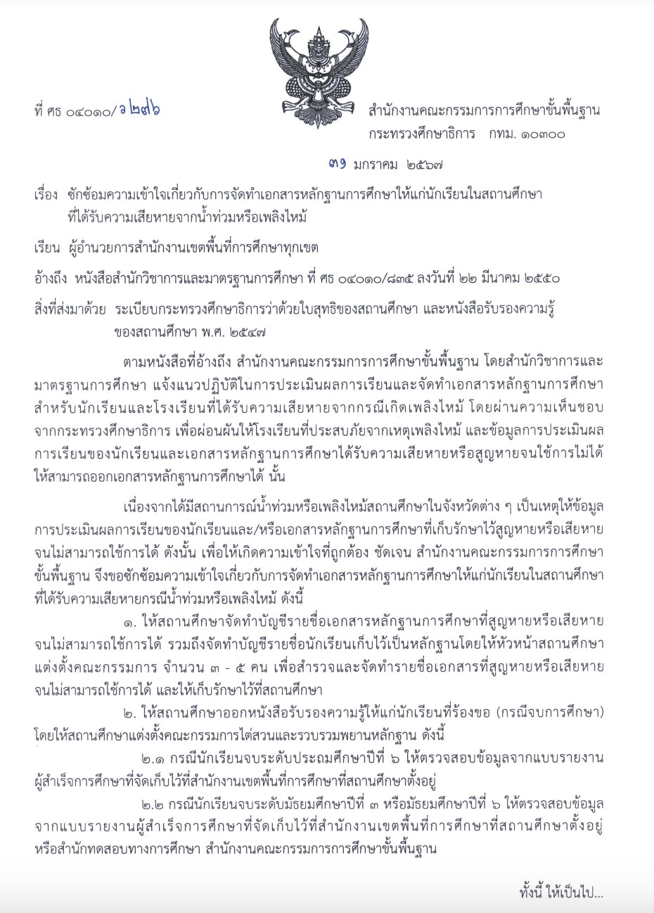 ศธ 04010/ว276 ลงวันที่ 31 มกราคม 2567 เรื่อง ซักซ้อมความเข้าใจเกี่ยวกับการจัดทำเอกสารหลักฐานการศึกษาให้แก่นักเรียนในสถานศึกษาที่ได้รับความเสียหายจากน้ำท่วมหรือเพลิงไหม้