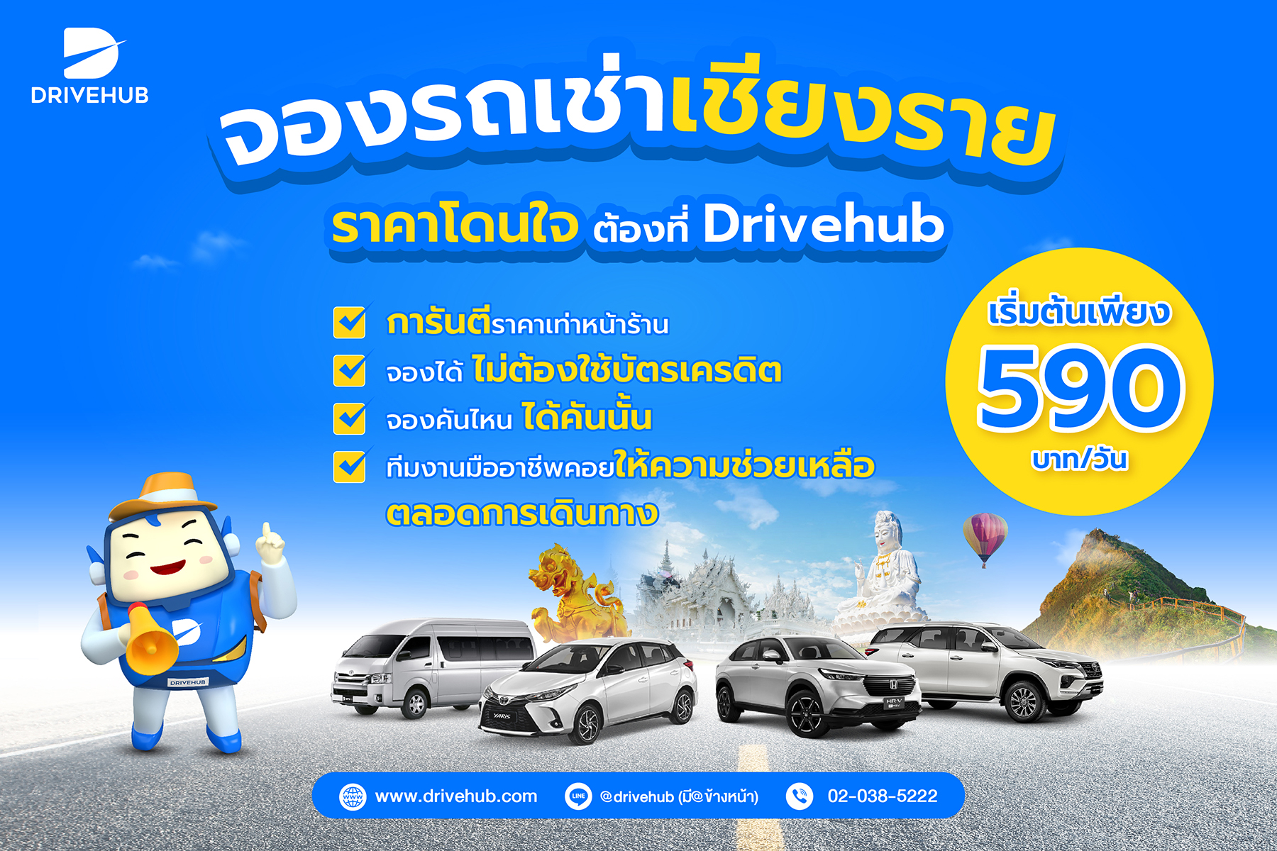 หากใครกำลังประสบปัญหานี้อยู่ ขอแนะนำ Drievhub แอปฯ รวมรถเช่าทั่วไทย และรถเช่าเชียงรายที่ได้คุณภาพ คัดสรรจากบริษัทรถเช่าเชียงรายท้องถิ่นที่ได้มาตรฐาน การันตีราคาเท่าหน้าร้าน จองง่ายๆ ผ่านแอปพลิเคชันหรือเว็บไซต์ได้เลย พร้อมข้อมูลและรถตรงปก จองคันไหน ได้คันนั้น แถมจองได้ไม่ต้องใช้บัตรเครดิต สะดวกสบายและง่ายสุดๆ อุ่นใจตลอดการเดินทาง ด้วยทีมงานมืออาชีพคอยให้ความช่วยเหลือ ขับเที่ยวเชียงรายได้สะดวกสบายกว่า พร้อมบริการรับ - ส่งฟรี สนามบิน ให้คุณเที่ยวเชียงรายได้อย่างไม่มีสะดุด “มองหารถเช่าทั่วไทย ราคาโดนใจ ต้องที่ Drivehub”
