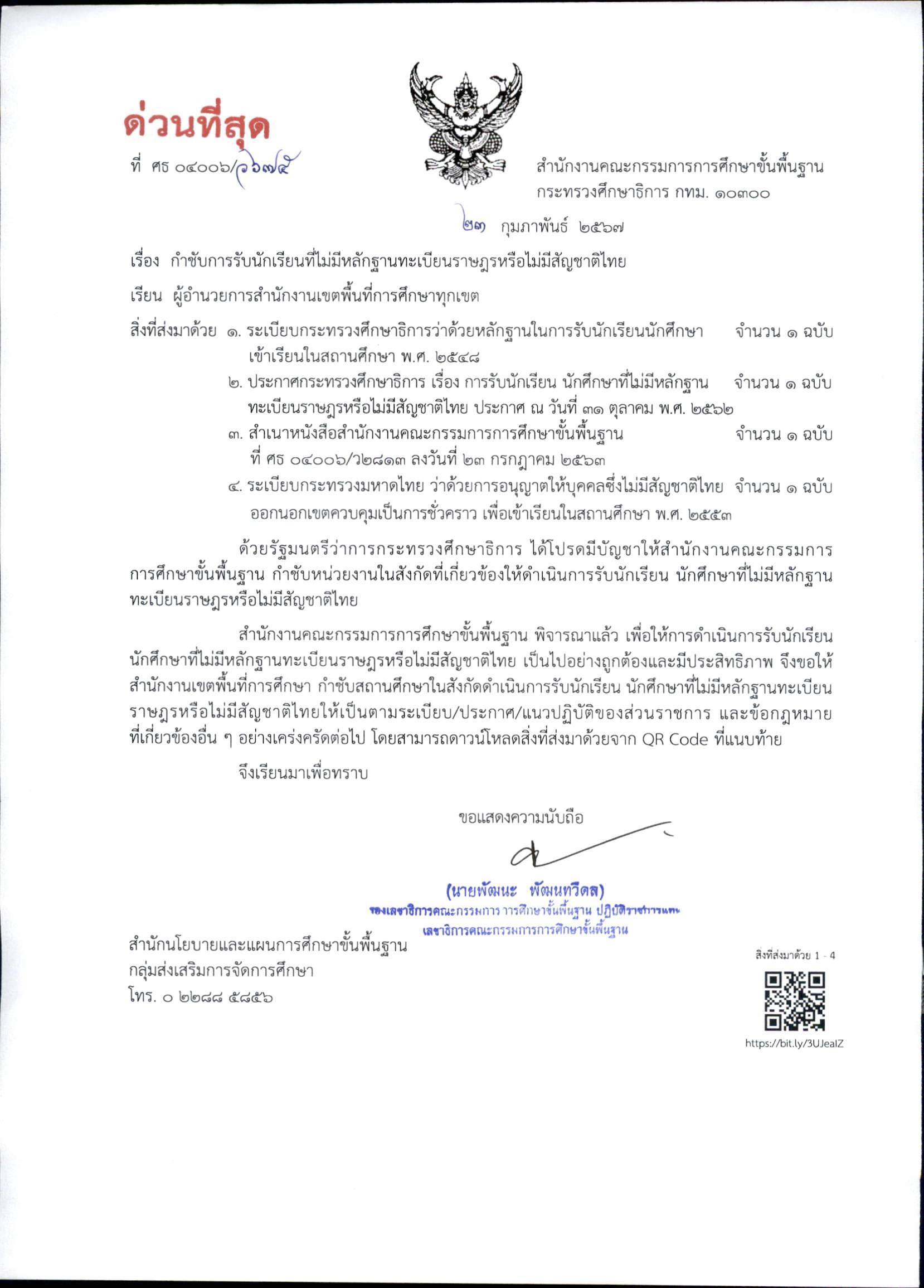กำชับการรับนักเรียนที่ไม่มีหลักฐานทะเบียนราษฎรหรือไม่มีสัญชาติไทย
