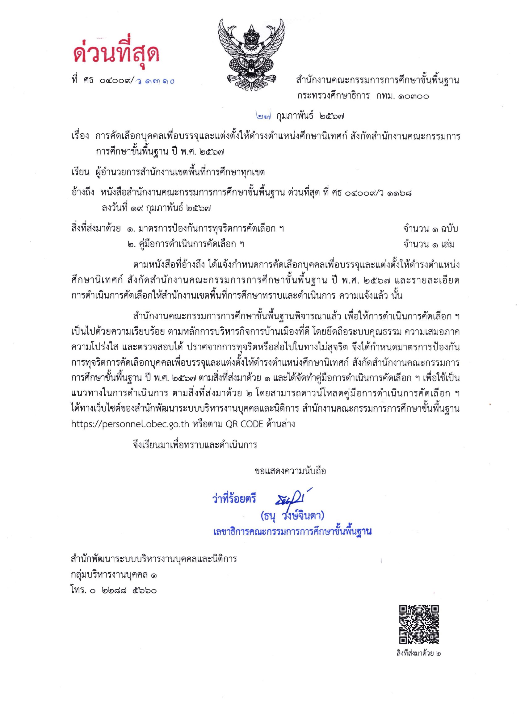 คู่มือและมาตรการป้องกันการทุจริตการคัดเลือกบุคคลเพื่อบรรจุและแต่งตั้งให้ดำรงตำแหน่งศึกษานิเทศก์ สังกัด สพฐ. ปี พ.ศ.2567