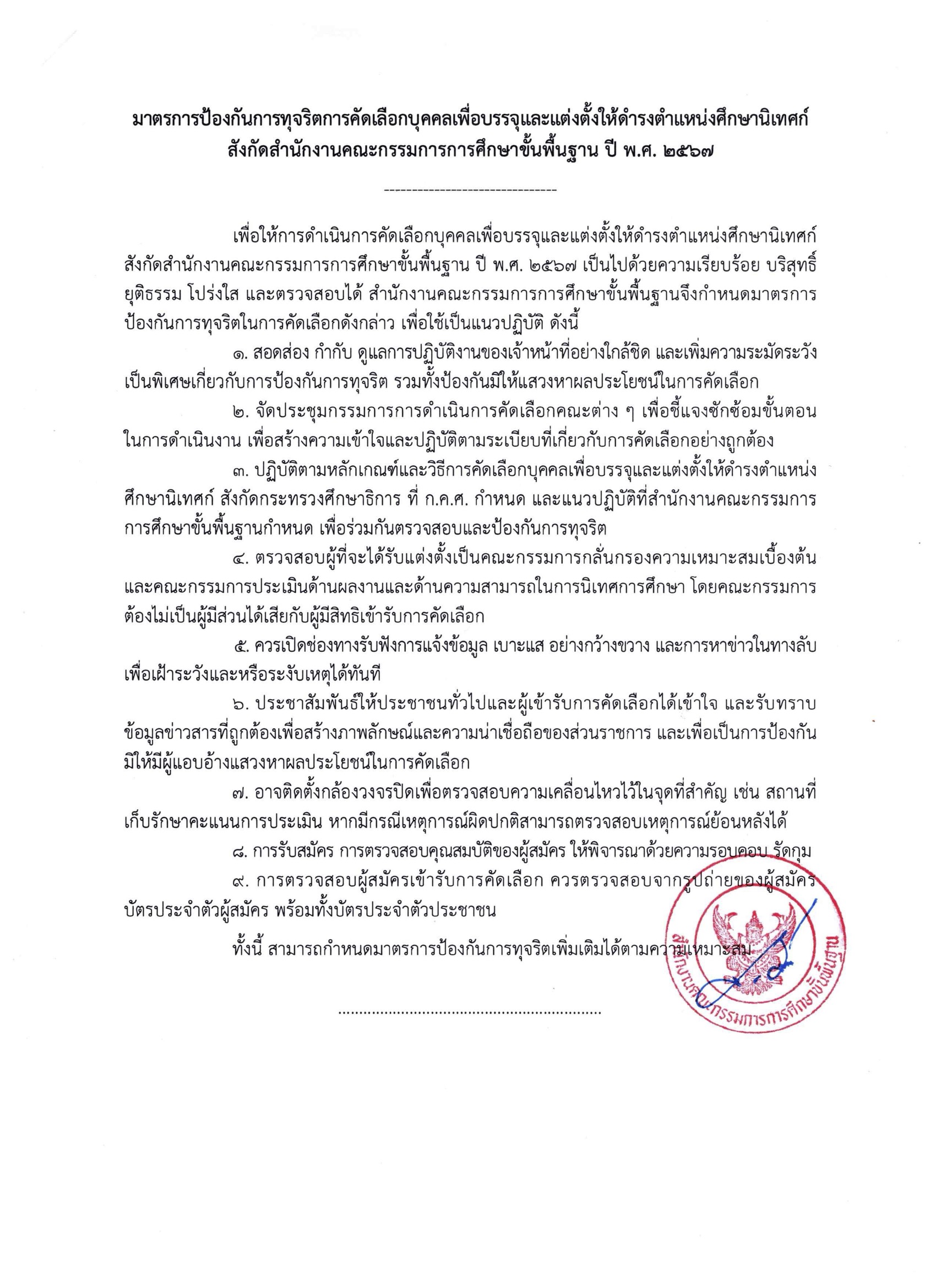 มาตรการป้องกันการทุจริตการคัดเลือกบุคคลเพื่อบรรจุและแต่งตั้งให้ดำรงตำแหน่งศึกษานิเทศก์ สังกัด สพฐ. ปี พ.ศ.2567