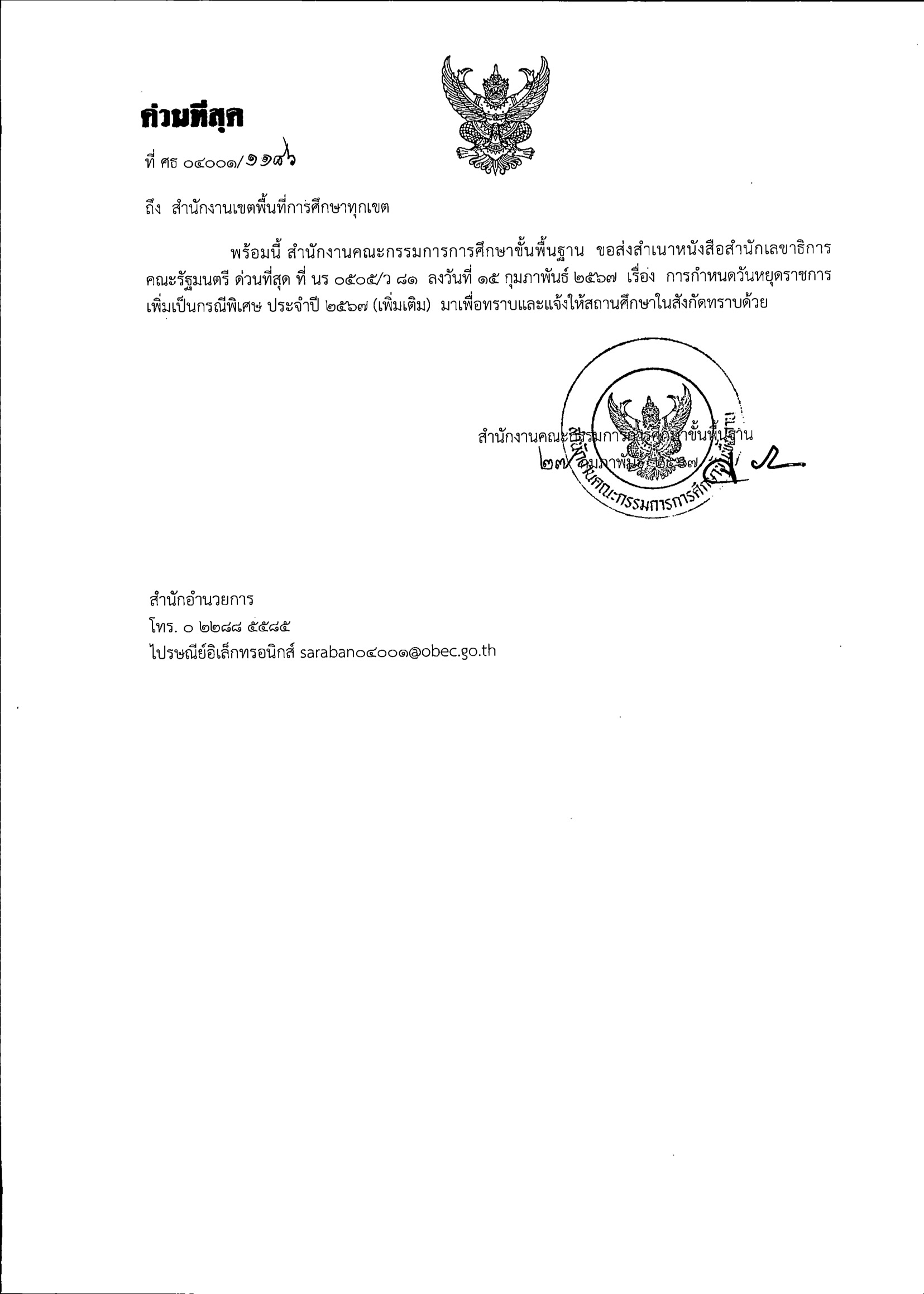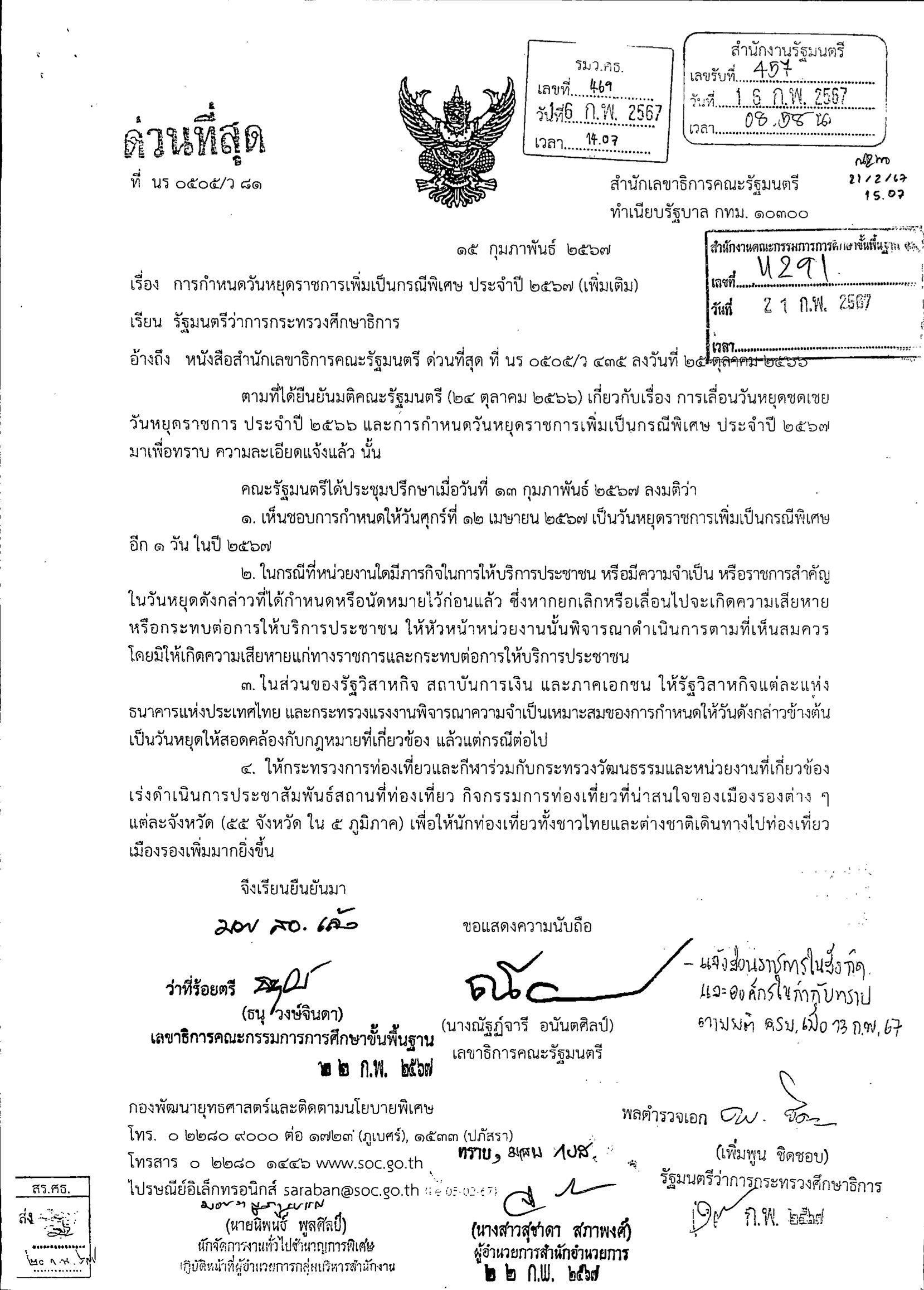 การกำหนดวันหยุดราชการเพิ่มเป็นกรณีพิเศษ ประจำปี 2567 (เพิ่มเติม)