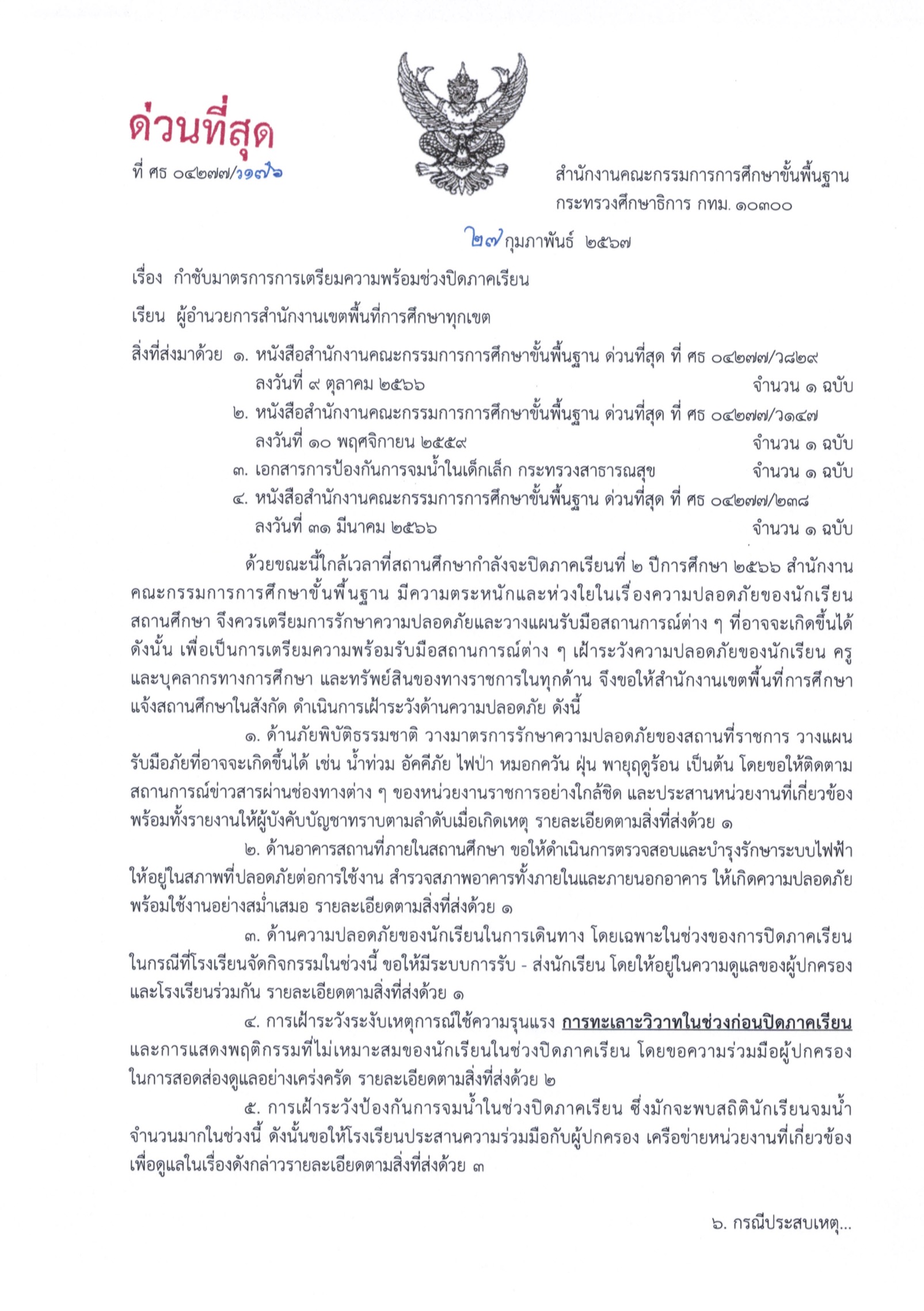 สำนักงานคณะกรรมการการศึกษาขั้นพื้นฐาน มีหนังสือกำชับมาตรการการเตรียมความพร้อมช่วงปิดภาคเรียน