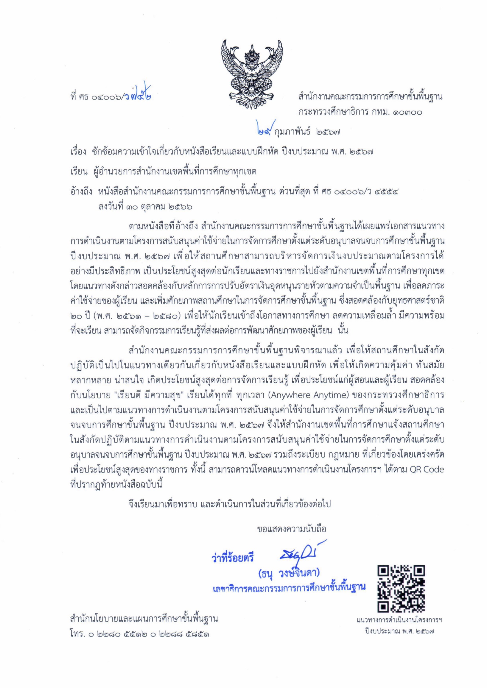 สำนักงานคณะกรรมการการศึกษาขั้นพื้นฐาน มีหนังสือ ศธ 04006/ว752 ลงวันที่ 4 มีนาคม 2567 เรื่อง ซักซ้อมความเข้าใจเรื่องการใช้หนังสือเรียน และสื่อการเรียนการสอน ปี 2567 รายละเอียด ดังนี้