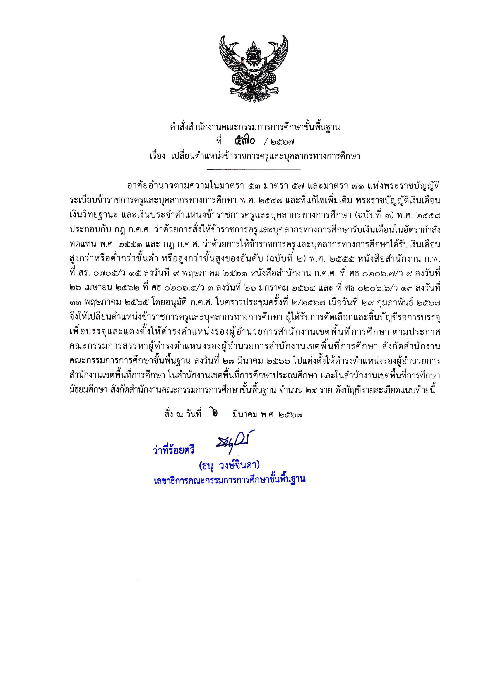 สำนักงานคณะกรรมการการศึกษาขั้นพื้นฐาน มีคำสั่ง ที่ 570/2567 เรื่อง เปลี่ยนตำแหน่งข้าราชการครูและบุคลากรทางการศึกษา สั่ง ณ วันที่ 6 มีนาคม 2567 โดยอนุมัติ ก.ค.ศ.ในคราวที่ประชุมครั้งที่ 2/2567 เมื่อวันที่ 29 กุมภาพันธ์ 2567 ให้เปลี่ยนตำแหน่งข้าราชการครูและบุคลากรทางการศึกษา ผู้ได้รับการคัดเลือกและขึ้นบัญชีรอการบรรจุเพื่อบรรจุและแต่งตั้งให้ดำรงตำแหน่งรองผู้อำนวยการสำนักงานเขตพื้นที่การศึกษา สังกัดสำนักงานคณะกรรมการการศึกษาขั้นพื้นฐาน ลงวันที่ 27 มีนาคม 2566 ไปแต่งตั้งให้ดำรงตำแหน่งรองผู้อำนวยการสำนักงานเขตพื้นที่การศึกษา ในสำนักงานเขตพื้นที่การศึกษาประถมศึกษา และในสำนักงานเขตพื้นที่การศึกษามัธยมศึกาา สังกัดสำนักงานคณะกรรมการการศึกษาขั้นพื้นฐาน จำนวน 24 ราย ดังนี้