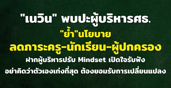 นายเนวิน กล่าวต่อไปว่า สิ่งที่อยากฝากผู้บริหารกระทรวง คือ เรื่องการลดภาระครู นักเรียน ผู้ปกครองเป็นเรื่องที่สำคัญต่อการเปลี่ยนแปลง หลายเรื่องดีๆ อาจนำมาปรับปรุงใช้ได้ เช่น การสอบเทียบในอดีต ทำอย่างไรให้เด็กที่จะเรียนมัธยมศึกษา 6 ปี สามารถที่จะจบได้ใน 5 ปี จะช่วยให้เด็กได้รับโอกาสจบไวขึ้น ทำงานหางานได้ไวขึ้น ผู้ปกครองมีหนี้สินน้อยลง รัฐบาลประหยัดงบประมาณได้มากขึ้น นอกจากนี้ ภาคเอกชนเน้นในเรื่อง Skill มากกว่า Degree ภาคการศึกษาจึงต้องปรับตัวเองให้ตรงกับ Demand Side เช่นเดียวกัน จะต้องวางแผนการผลิตและพัฒนากำลังคนให้มีทักษะ ตามความต้องการจากภารผลิตและบริการ