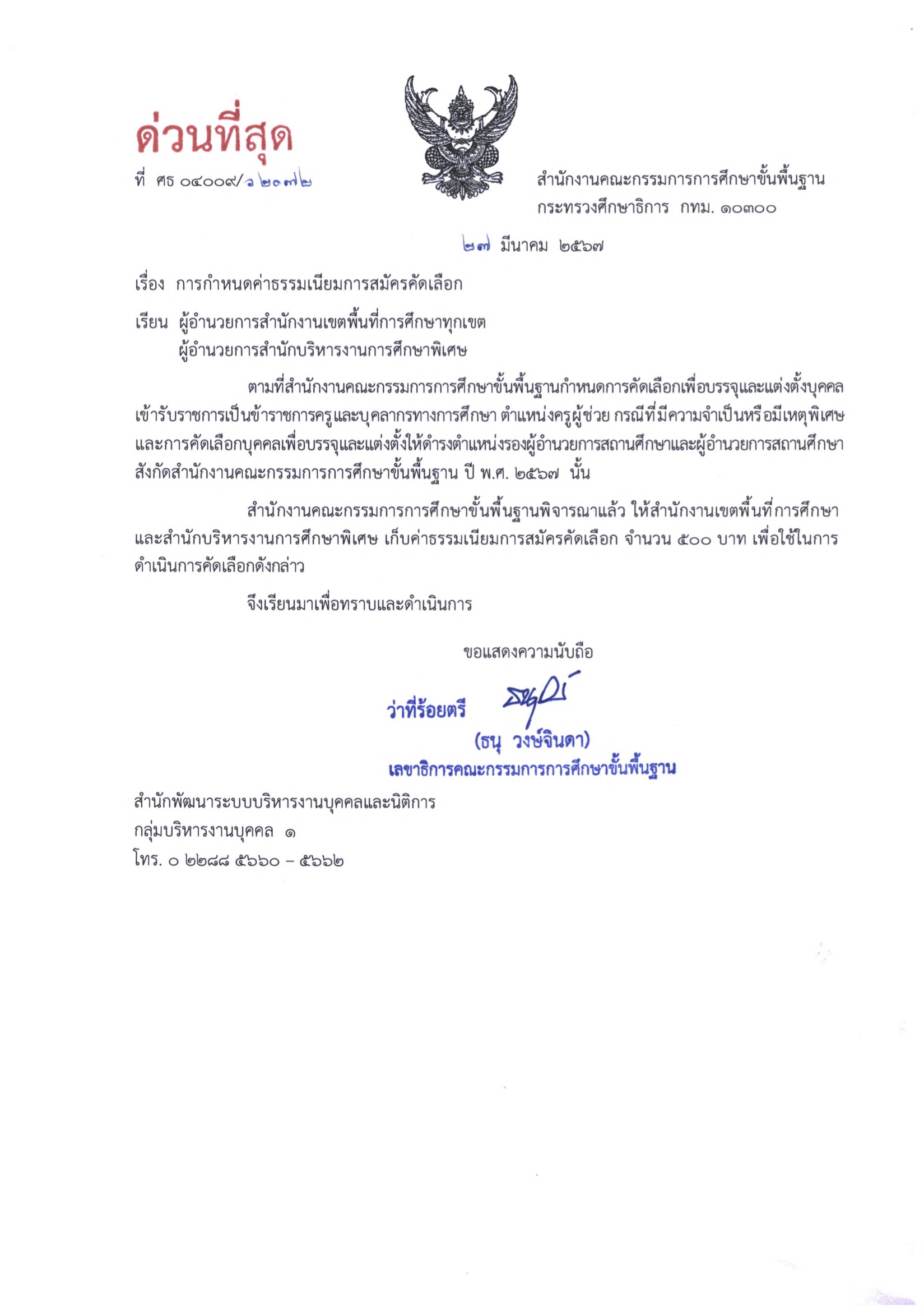 เมื่อวันที่ 27 มีนาคม 2567สำนักงานคณะกรรมการการศึกษาขั้นพื้นฐาน มีหนังสือ ที่ศธ 04009/ว 2072 เรื่อง การกำหนดค่าธรรมเนียมการสมัครคัดเลือก ถึง ผู้อำนวยการสำนักงานเขตพื้นที่การศึกษาทุกเขต และผู้อำนวยการสำนักบริหารงานการศึกษาพิเศษ เนื้อความว่า ตามที่สำนักงานคณะกรรมการการศึกษาขั้นพื้นฐาน กำหนดการคัดเลือกเพื่อบรรจุและแต่งตั้งบุคคลเข้ารับราชการเป็นข้าราชการครูและบุคลากรทางการศึกษา ตำแหน่ง ครูผู้ช่วย กรณีที่มีความจำเป็นหรือมีเหตุพิเศษ และการคัดเลือกบุคคลเพื่อบรรจุและแต่งตั้งให้ดำรงตำแหน่งรองผู้อำนวยการสถานศึกษาและผู้อำนวยการสถานศึกษา สังกัดสำนักงานคณะกรรมการการศึกษาขั้นพื้นฐาน ปี พ.ศ.2567 นั้น