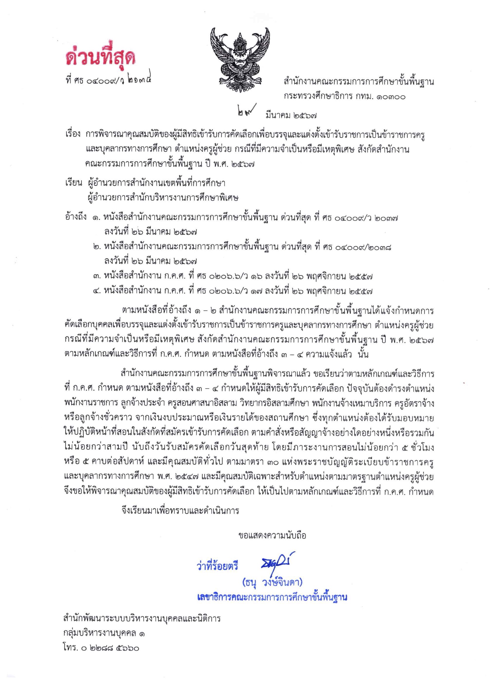 การพิจารณาคุณสมบัติของผู้มีสิทธิเข้ารับการคัดเลือกเพื่อบรรจุและแต่งตั้งเข้ารับราชการเป็นข้าราชการครูและบุคลากรทางการศึกษา ตำแหน่งครูผู้ช่วย กรณีที่มีความจำเป็นหรือมีเหตุพิเศษ สังกัด สพฐ. ปี พ.ศ. 2567