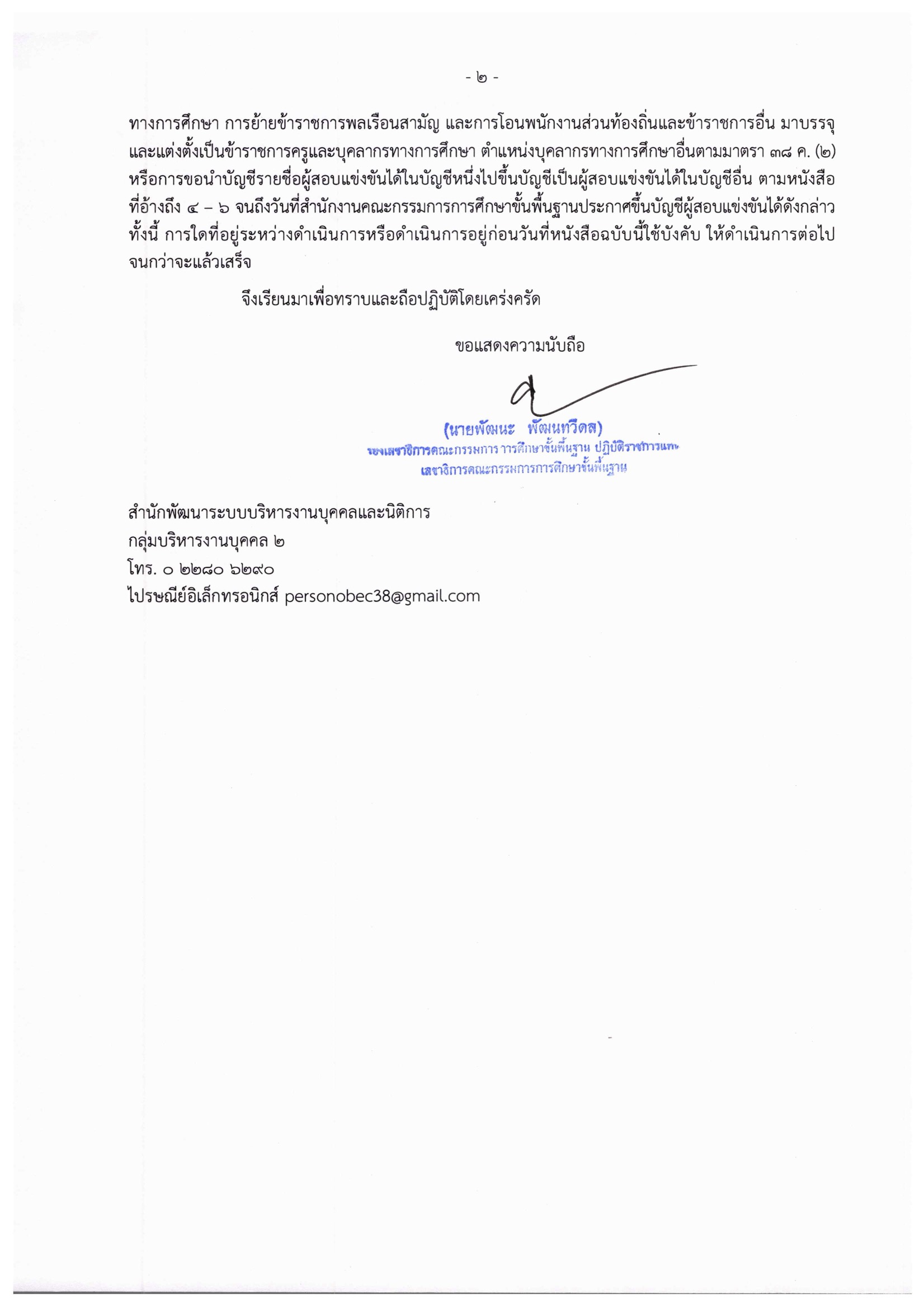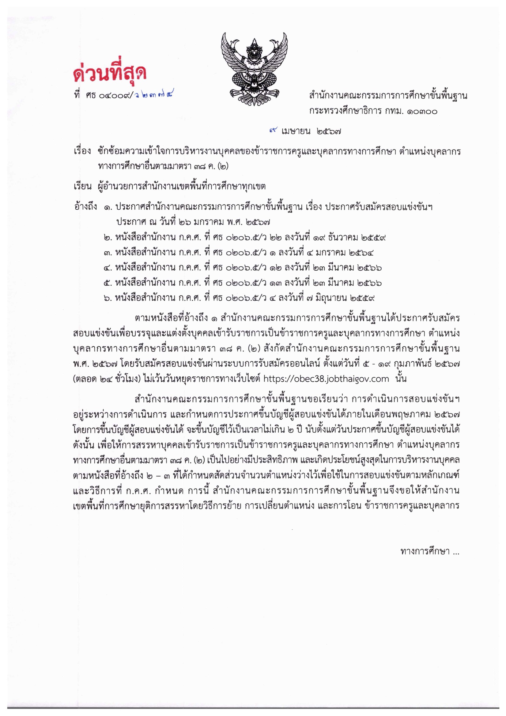 สำนักงานคณะกรรมการการศึกษาขั้นพื้นฐาน ขอเรียนว่า การดำเนินการสอบแข่งขันฯ อยู่ระหว่างการดำเนินการ และกำหนดการประกาศขึ้นบัญชีผู้สอบแข่งขันได้ ภายในเดือนพฤษภาคม 2567 โดยการขึ้นบัญชีผู้สอบแข่งขันได้ จะขึ้นบัญชีไว้เป็นเวลาไม่เกิน 2 ปี นับตั้งแต่วันประกาศขึ้นบัญชีผู้สอบแข่งขันได้ ดังนั้น เพื่อให้การสรรหาบุคคลเข้ารับราชการเป็นข้าราชการครูและบุคลากรทางการศึกษาตำแหน่งบุคลากรทางการศึกษาอื่น ตามมาตรา 38ค.(2) เป็นไปอย่างมีประสิทธิภาพ และเกิดประโยชน์สูงสุดในการบริหารงานบุคคล ตามหนังสือที่อ้างถึง 2-3 ที่ได้กำหนดสัดส่วนจำนวนตำแหน่งว่างไว้ เพื่อใช้ในการสอบแข่งขันตามหลักเกณฑ์และวิธีการที่ก.ค.ศ.กำหนด การนี้ สำนักงานคณะกรรมการการศึกษาขั้นพื้นฐานจึงขอให้สำนักงานเขตพื้นที่การศึกษา ยุติการสรรหาโดยวิธีการย้าย การเปลี่ยนตำแหน่ง และการโอนข้าราชการครูและบุคลากรทางการศึกษา การย้ายข้าราชการพลเรือนสามัญ และการโอนพนักงานส่วนท้องถิ่นและข้าราชการอื่นมาบรรจุและแต่งตั้งเป็นข้าราชการครูและบุคลากรทางการศึกษา ตำแหน่งบุคลากรทางการศึกษาอื่น ตามมาตรา 38ค.(2) หรือการขอนำบัญชีรายชื่อผู้สอบแข่งขันได้ในบัญชีหนึ่ง ไปขึ้นบัญชีเป็นผู้สอบแข่งขันได้ในบัญชีอื่น ตามหนังสือที่อ้างถึง 4-6 จนถึงวันที่สำนักงานคณะกรรมการการศึกษาขั้นพื้นฐาน ประกาศขึ้นบัญชีผู้สอบแข่งขันได้ดังกล่าว ทั้งนี้ การใดที่อยู่ระหว่างดำเนินการ หรือดำเนินการอยู่ก่อนวันที่หนังสือฉบับนี้ใช้บังคับให้ดำเนินการต่อไป จนกว่าจะแล้วเสร็จ