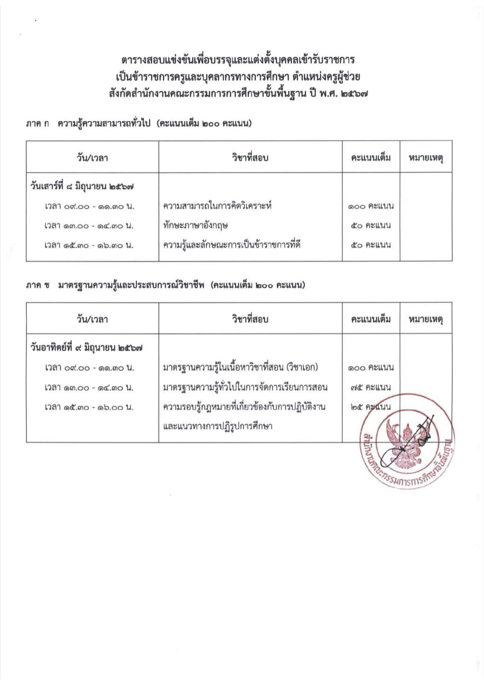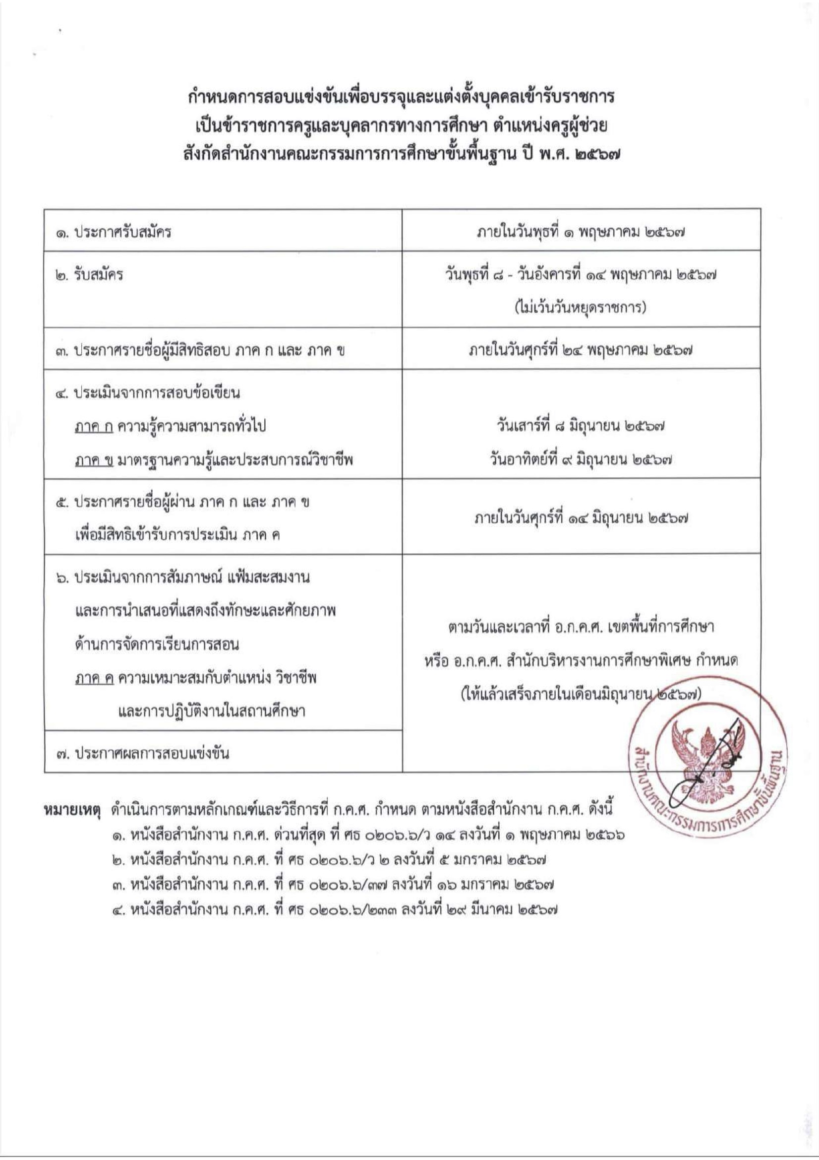 ที่ ศธ 04009/ ว 2508 ลงวันที่ 18 เมษายน 2567 เรื่อง การสอบแข่งขันเพื่อบรรจุและแต่งตั้งบุคคลเข้ารับราชการเป็นข้าราชการครูและบุคลากรทางการศึกษา ตำแหน่งครูผู้ช่วย สังกัดสำนักงานคณะกรรมการการศึกษาขั้นพื้นฐาน ปี พ.ศ. 2567