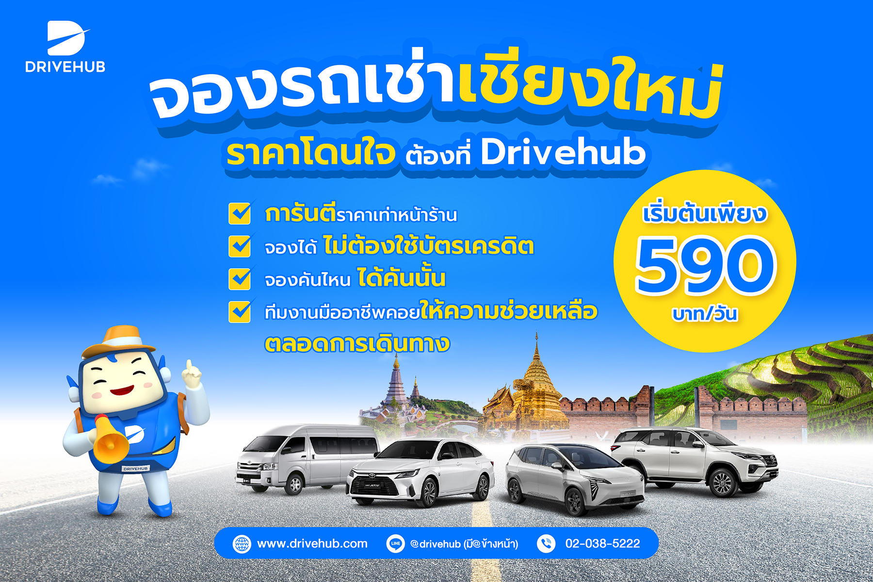 Drivehub แอปฯ รวมรถเช่าเชียงใหม่และรถเช่าทั่วไทยคัดสรรคุณภาพ ได้มาตรฐานจากบริษัทรถเช่าท้องถิ่นที่ไว้ใจได้ การันตีราคาเท่าหน้าร้าน ไม่มีบวกเพิ่ม สามารถจองได้โดยไม่ต้องใช้บัตรเครดิต จองคันไหนได้คันนั้น ได้รถตรงปกชัวร์ พร้อมทีมงานมืออาชีพ คอยให้ความช่วยเหลือตลอดการเดินทาง ขับรถเที่ยวเชียงใหม่ได้อย่างอุ่นใจ เมื่อจองรถเช่ากับ Drivehub เริ่มต้นเพียง 590 บาท / วัน