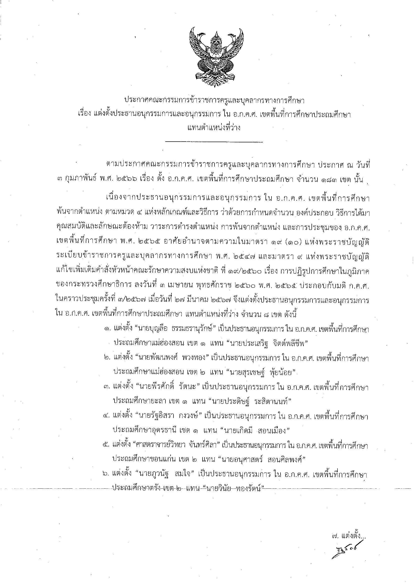 ประกาศคณะกรรมการข้าราชการครูและบุคลากรทางการศึกษา เรื่อง แต่งตั้งประธานอนุกรรมการและอนุกรรมการ ใน อ.ก.ค.ศ. เขตพื้นที่การศึกษาประถมศึกษา แทนตำแหน่งที่ว่าง