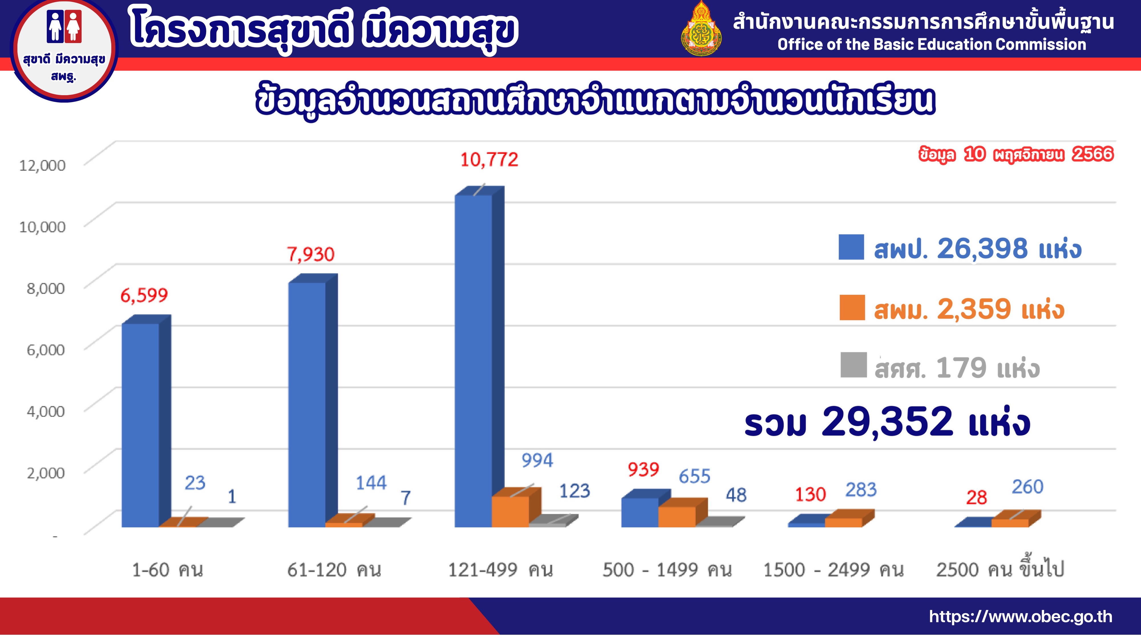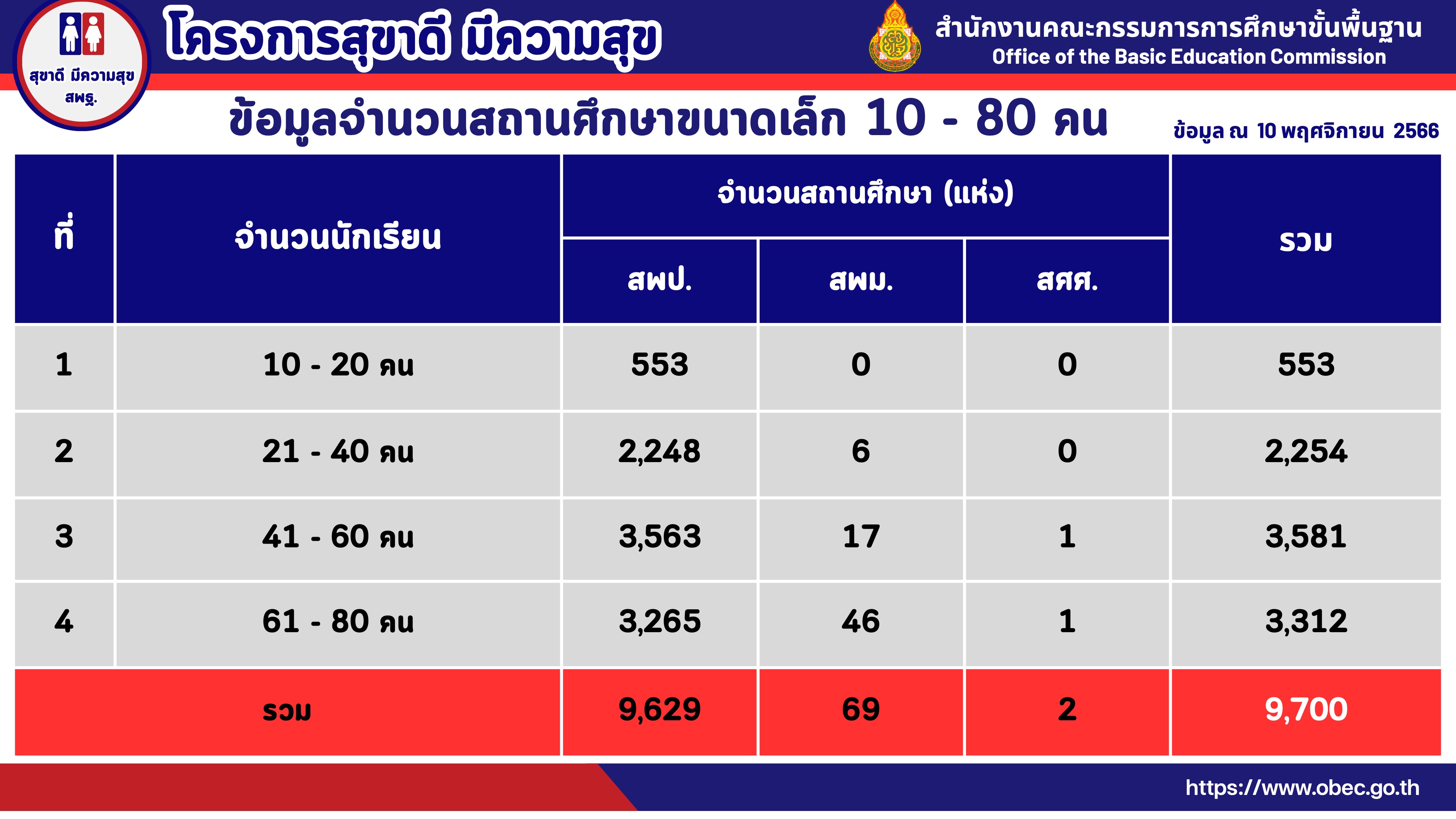 ทั้งนี้ ข้อมูลจำนวนสถานศึกษาขนาดเล็ก 10 - 80 คน ซึ่งเป็นข้อมูล ณ 10 พฤศจิกายน 2566 มีจำนวน 9,700 โรงเรียน