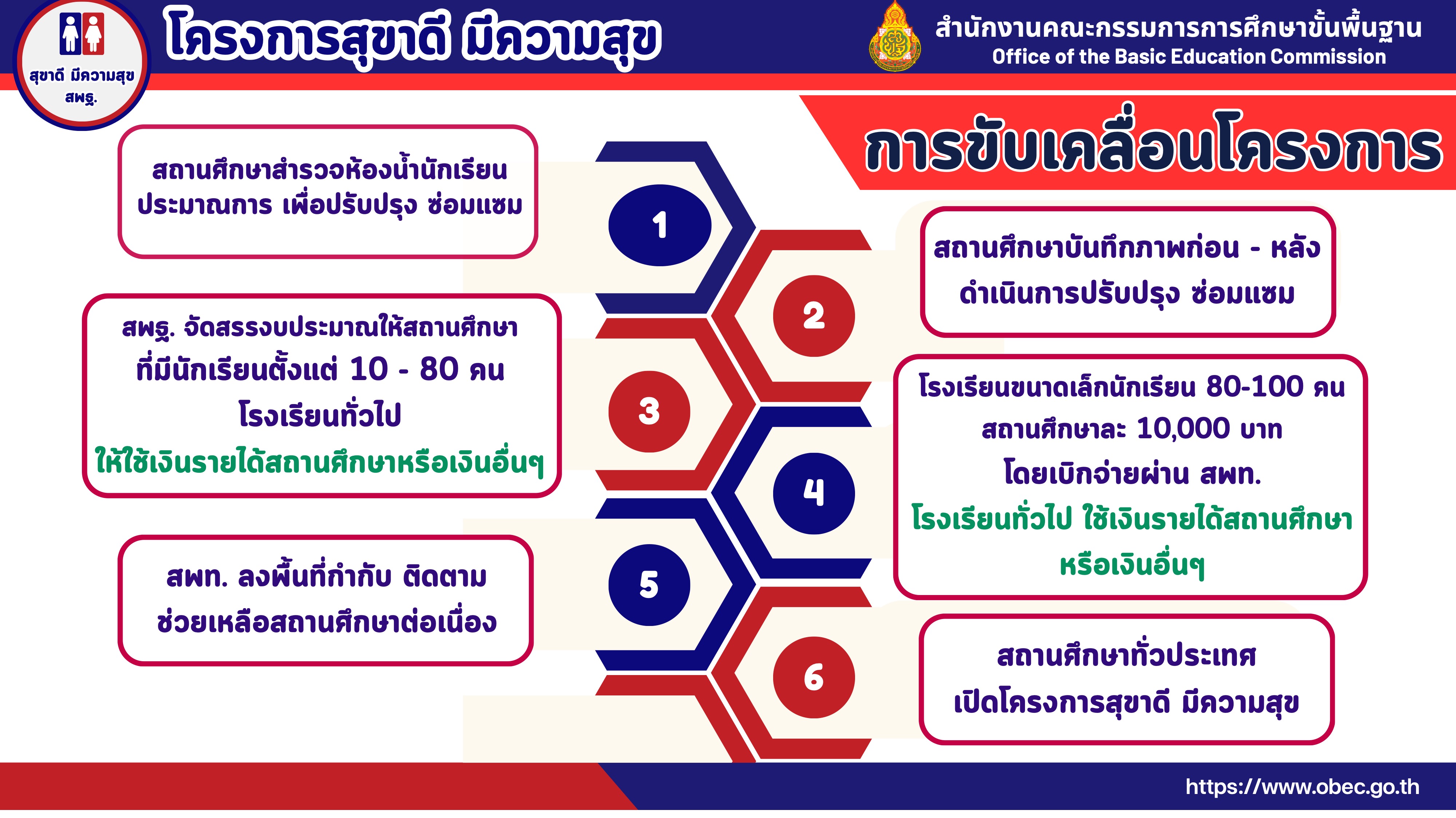 โดยมีแนวทางในการดำเนินการโดย โรงเรียนขนาดเล็ก (นักเรียน 10-80 คน) สพฐ.จะจัดสรรงบประมาณ ให้โรงละ 10,000 บาท ส่วนโรงเรียนทั่วไป (นักเรียนตั้งแต่ 81 คน ขึ้นไป) นั้นให้ดำเนินการปรับปรุง ซ่อมแซม โดนใช้เงินรายได้สถานศึกษาหรือเงินอื่นๆ ทั้งนี้ สพฐ.จะพิจารณาจัดสรรงบประมาณในโอกาสต่อไป