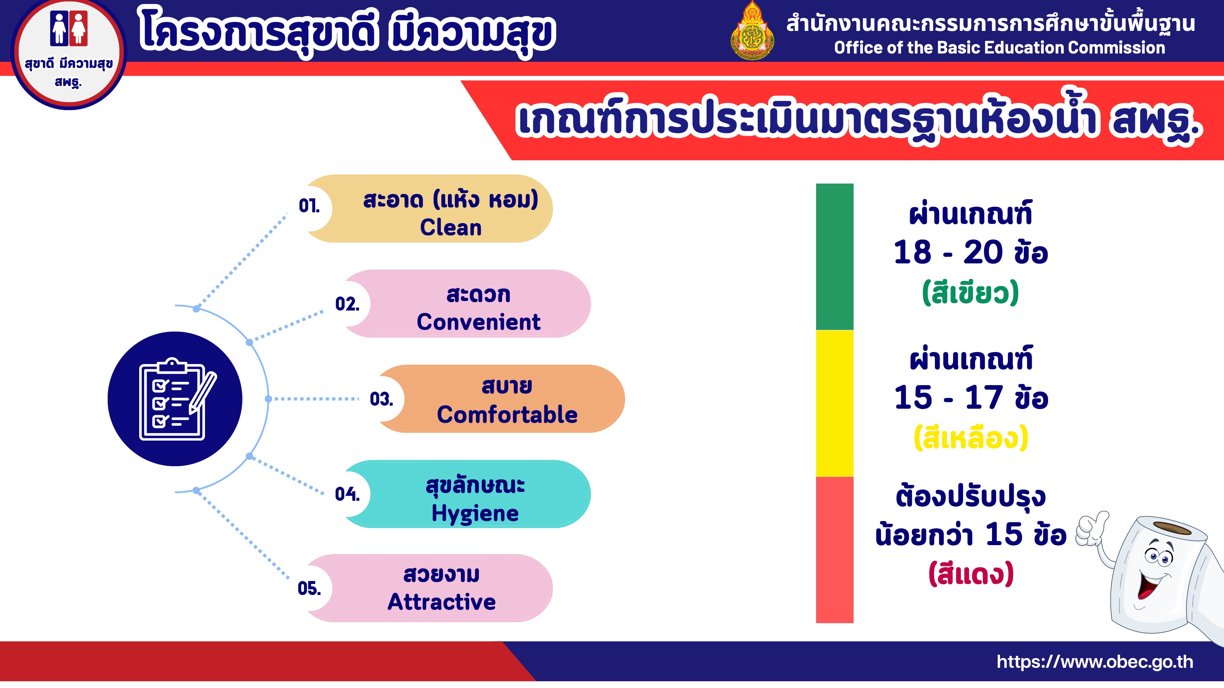 - 30 มิ.ย. 67 สพฐ. ประเมินตามเกณฑ์มาตรฐาน ห้องน้ำนักเรียน สพฐ."สะอาด สะดวก สบาย สุขลักษณะ สวยงาม"