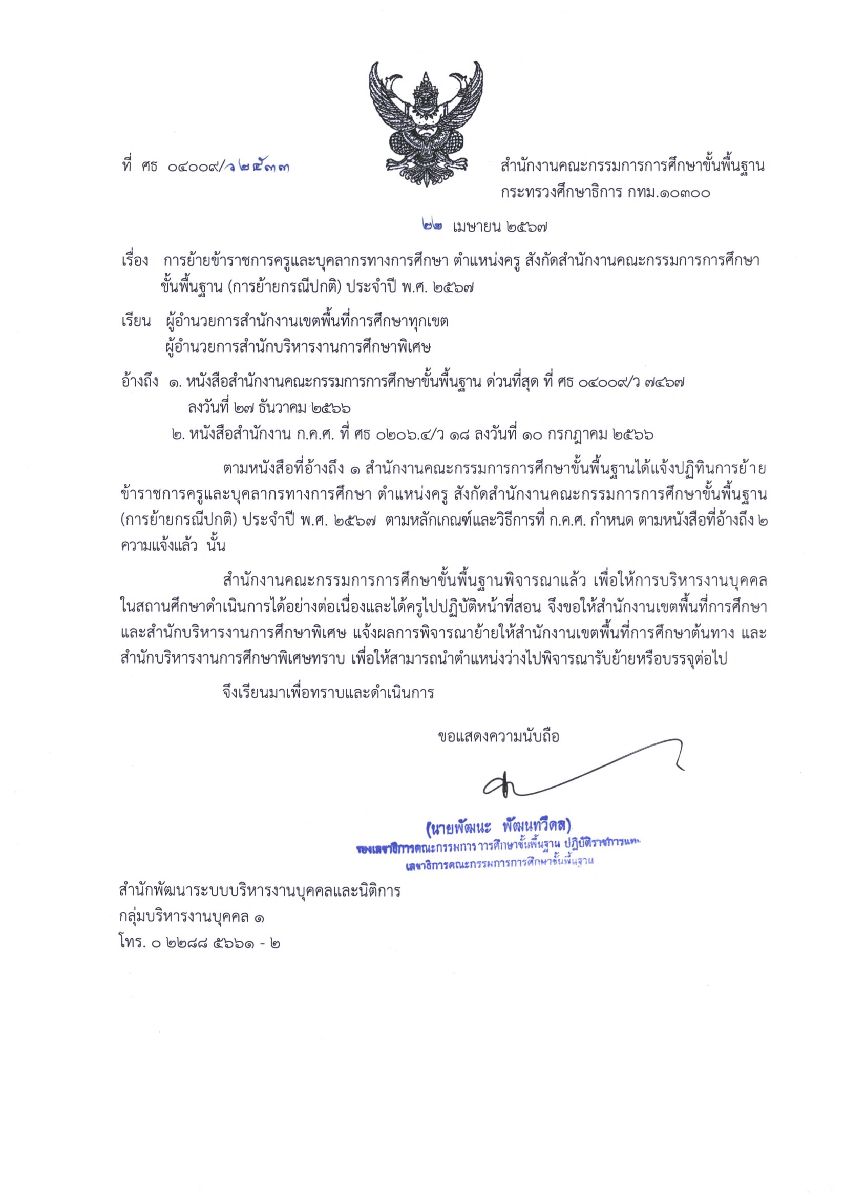 ตามที่ สำนักงานคณะกรรมการการศึกษาขั้นพื้นฐาน ได้แจ้งปฏิทินการย้ายข้าราชการครูและบุคลากรทางการศึกษา ตำแหน่ง ครู สังกัดสำนักงานคณะกรรมการการศึกษาขั้นพื้นฐาน (การย้ายกรณีปกติ) ประจำปีพ.ศ.2567 ตามหลักเกณฑ์และวิธีการที่ ก.ค.ศ.กำหนด นั้น