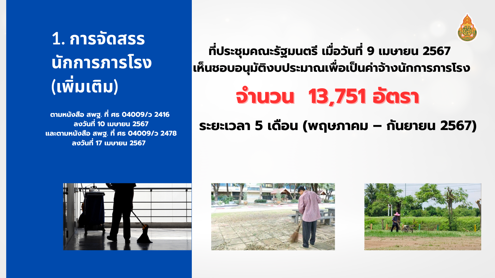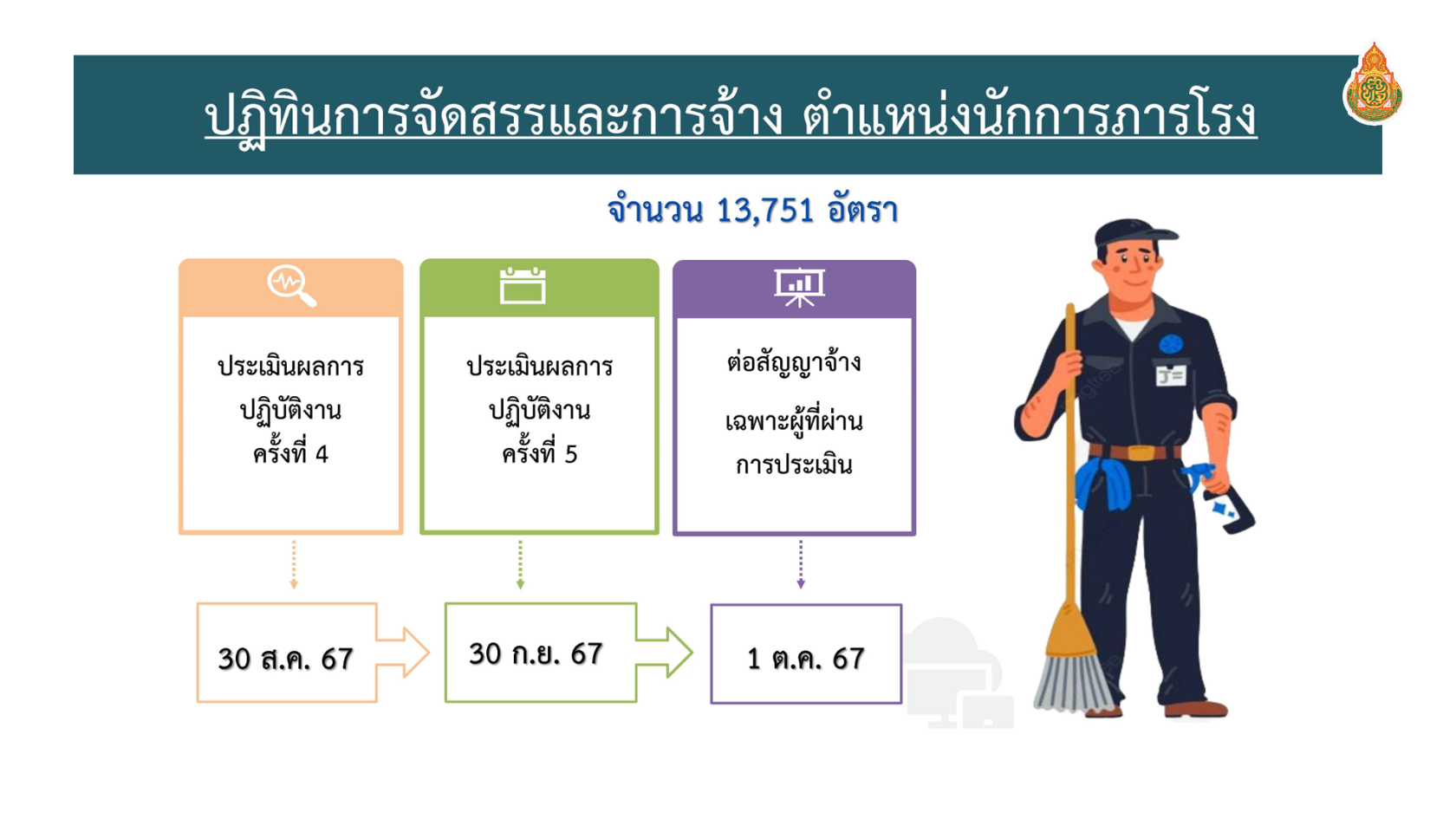 เมื่อวันที่ 23 เม.ย. นายพัฒนะ พัฒนทวีดล รองเลขาธิการคณะกรรมการการศึกษาขั้นพื้นฐาน ได้นำเสนอข้อมูล ในที่ประชุมผู้อำนวยการสำนักงานเขตพื้นที่การศึกษา (สพท.) ทั่วประเทศ ณ โรงเรียนสตรีนนทบุรี จ.นนทบุรี เกี่ยวกับการจัดสรรนักการภารโรง(เพิ่มเติม) ตามหนังสือ สพฐ. ที่ ศธ 04009/ว 2416ลงวันที่ 10 เมษายน 2567 และตามหนังสือ สพฐ. ที่ ศธ 04009/ว 2478 ลงวันที่ 17 เมษายน 2567 ตามที่ประชุมคณะรัฐมนตรี เมื่อวันที่ 9 เมษายน 2567 เห็นชอบอนุมัติงบประมาณเพื่อเป็นค่าจ้างนักการภารโรง จำนวน 13,751 อัตรา ระยะเวลา 5 เดือน (พฤษภาคม – กันยายน 2567) ซึ่งมีปฏิทินการจัดสรรและการจ้าง ตำแหน่งนักการภารโรง ดังนี้