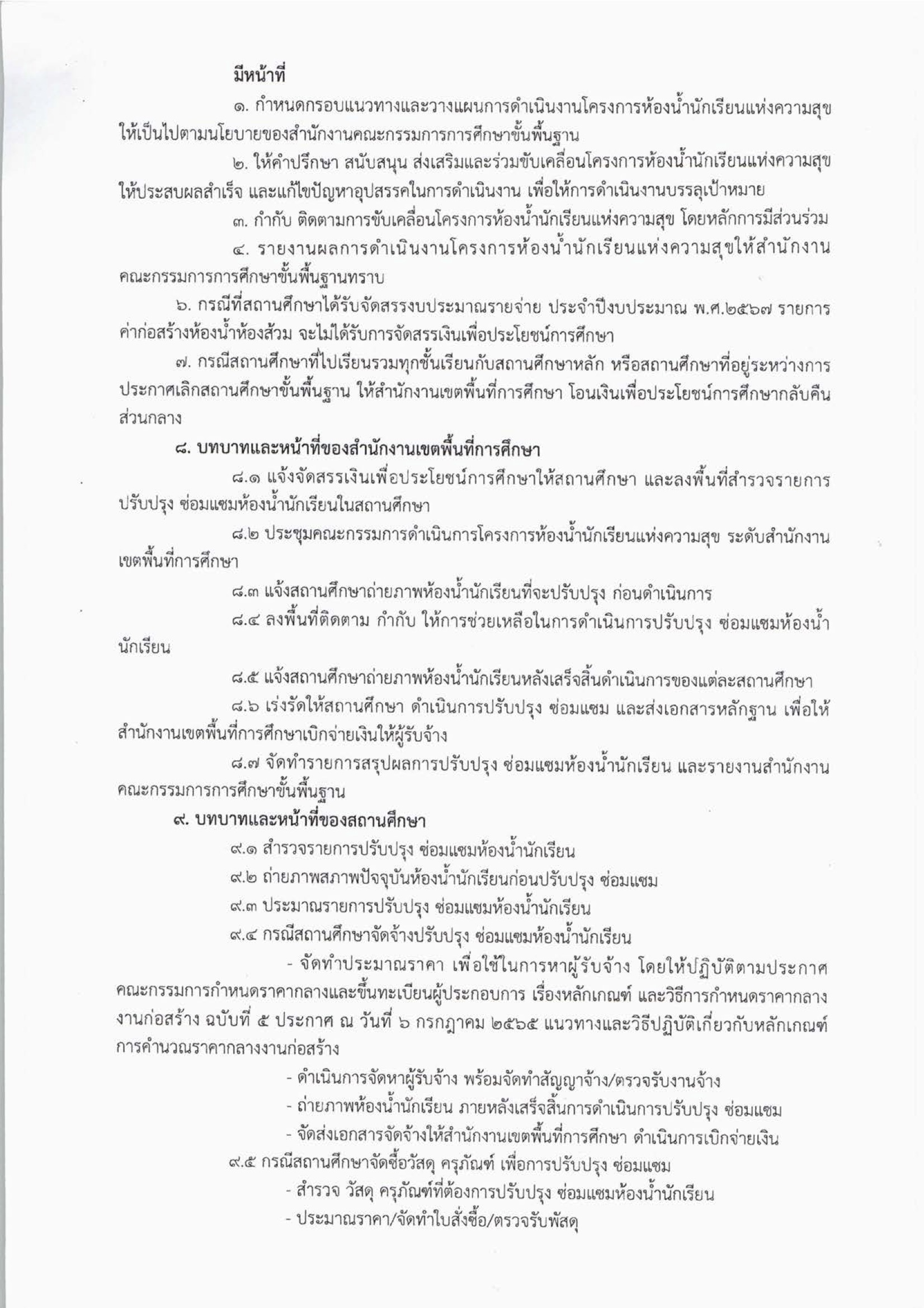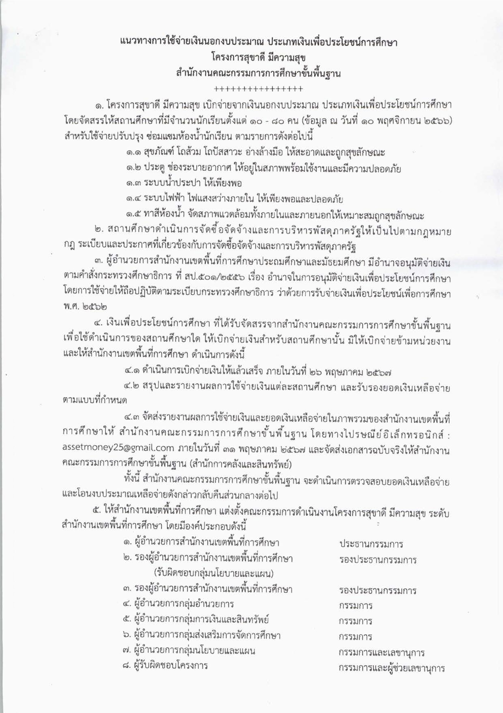 สำนักงานคณะกรรมการการศึกษาขั้นพื้นฐานพิจารณาแล้ว เพื่อให้การดำเนินการเป็นไปตาม นโยบายการศึกษาและแนวทางการขับเคลื่อนนโยบาย "เรียนดี มีความสุข" ของรัฐมนตรีว่าการกระทรวงศึกษาธิการ และจุดเน้นของสำนักงานคณะกรรมการการศึกษาขั้นพื้นฐาน ในด้านการเสริมสร้างความสุขและความปลอดภัย ของสถานศึกษา จึงอนุมัติจัดสรรเงินเพื่อประโยชน์การศึกษา สำหรับเป็นค่าปรับปรุงซ่อมแซมห้องน้ำนักเรียน ให้กับโรงเรียนขนาดเล็กที่มีจำนวนนักเรียนตั้งแต่ 10 คน แต่ไม่เกิน 80 คน โดยขอให้สำนักงานเขตพื้นที่การศึกษาแจ้งโรงเรียนที่ได้รับการจัดสรรงบประมาณปฏิบัติตามระเบียบ กระทรวงศึกษาธิการ ว่าด้วยการรับจ่ายเงินเพื่อประโยชน์การศึกษา พ.ศ. 2562 และคำสั่งกระทรวงศึกษาธิการ เรื่อง อำนาจในการอนุมัติจ่ายเงินเพื่อประโยชน์การศึกษา รวมทั้งดำเนินการตามแนวทางการใช้จ่าย เงินนอกงบประมาณ ประเภทเงินเพื่อประโยชน์การศึกษาฯ อย่างเคร่งครัด โดยดำเนินการจัดซื้อจัดจ้างให้เป็นไปตามพระราชบัญญัติการจัดซื้อจัดจ้างและการบริหารพัสดุภาครัฐ พ.ศ. 2560 ระเบียบกระทรวงการคลังว่าด้วยการจัดซื้อจัดจ้างและการบริหารพัสดุภาครัฐ พ.ศ. 2560กฎหมาย ระเบียบ รวมทั้งมติคณะรัฐมนตรีที่เกี่ยวข้อง ทั้งนี้ จะก่อหนี้ผูกพันได้ก็ต่อเมื่อได้รับการโอนจัดสรรเงินงบประมาณแล้วเท่านั้น