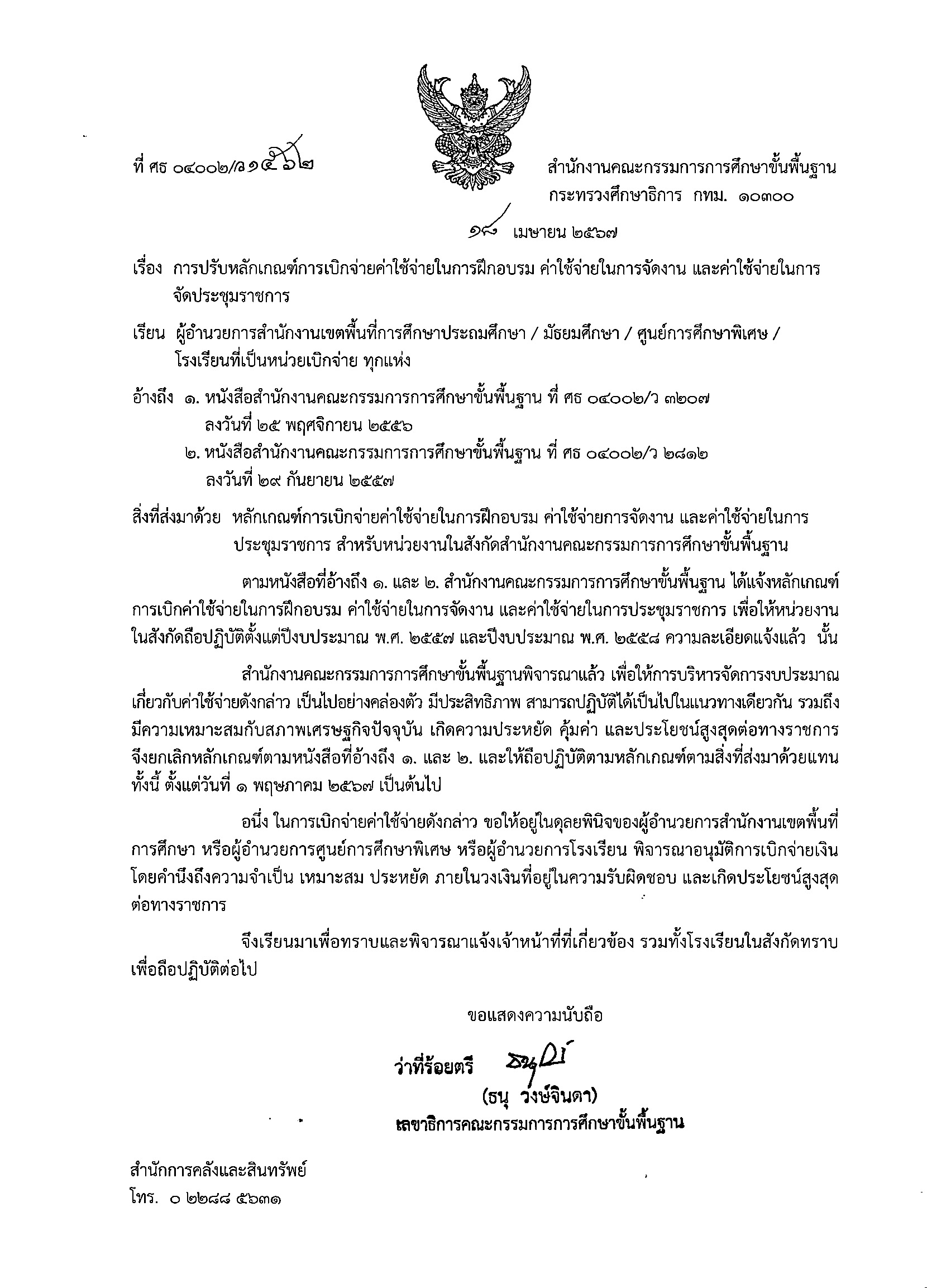 สำนักงานคณะกรรมการคณะกรรมการการศึกษาขั้นพื้นฐาน ได้มีหนังสือ ที่ ศธ 04002/ว1562 ลงวันที่ 18 เมษายน 2567 เรื่อง การปรับหลักเกณฑ์การเบิกจ่ายค่าใช้จ่ายในการฝึกอบรม การจัดงาน และการจัดประชุมราชการ รายละเอียดด้านล่าง