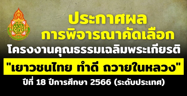 ประกาศผลการพิจารณาคัดเลือกโครงงานคุณธรรมเฉลิมพระเกียรติ “เยาวชนไทย ทำดี ถวายในหลวง” ปีที่ 18 ปีการศึกษา 2566 (ระดับประเทศ)