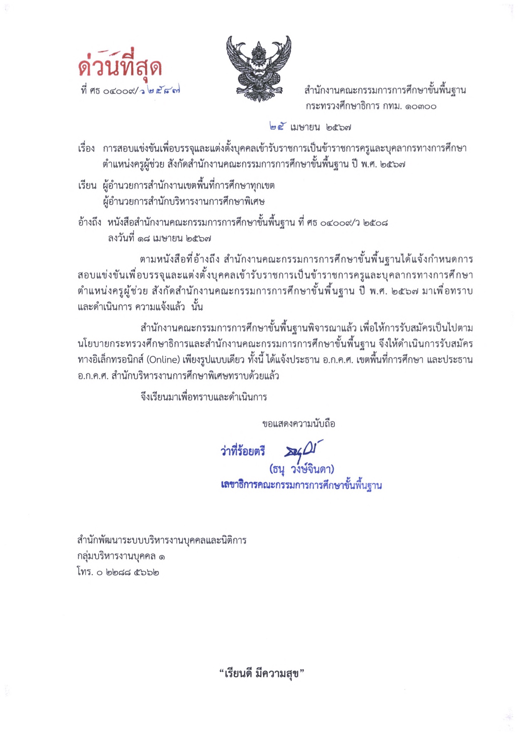 ที่ ศธ 04009/ ว 2508 ลงวันที่ 18 เมษายน 2567 เรื่อง การสอบแข่งขันเพื่อบรรจุและแต่งตั้งบุคคลเข้ารับราชการเป็นข้าราชการครูและบุคลากรทางการศึกษา ตำแหน่งครูผู้ช่วย สังกัดสำนักงานคณะกรรมการการศึกษาขั้นพื้นฐาน ปี พ.ศ. 2567