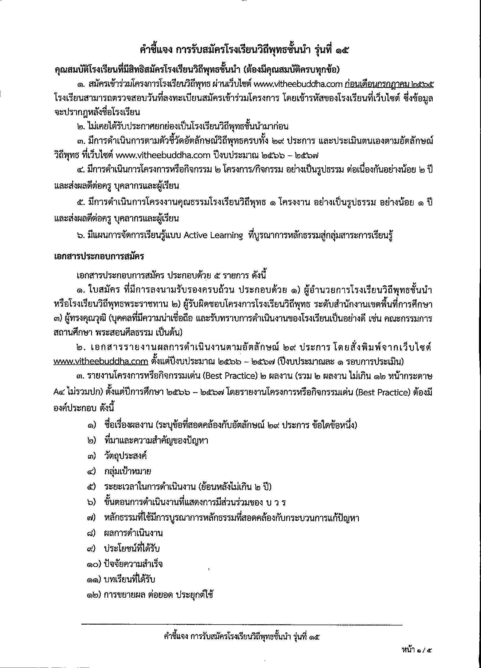 ในการนี้ สำนักงานคณะกรรมการการศึกษาขั้นพื้นฐาน ขอประชาสัมพันธ์ให้โรงเรียนที่เข้าร่วมโครงการโรงเรียนวิถีพุทธในสังกัดที่สนใจและสมัครใจเข้ารับการประเมินเป็นโรงเรียนวิถีพุทธชั้นนำ รุ่นที่ 15 โดยเปิดรับสมัครตั้งแต่วันที่ 1 พฤษภาคม - 15 กรกฎาคม 2567 ผ่านระบบออนไลน์ ทั้งนี้ ให้โรงเรียนจัดส่งเอกสารประกอบการพิจารณาไปที่สำนักงานพระสอนศีลธรรม มหาวิทยาลัยมหาจุฬาลงกรณ ราชวิทยาลัย อาคาร มหาจุฬาบรรณาคาร ชั้น 2 ตำบล ลำไทร อำเภอ วังน้อย จังหวัด พระนครศรีอยุธยา รายละเอียดด้านล่าง