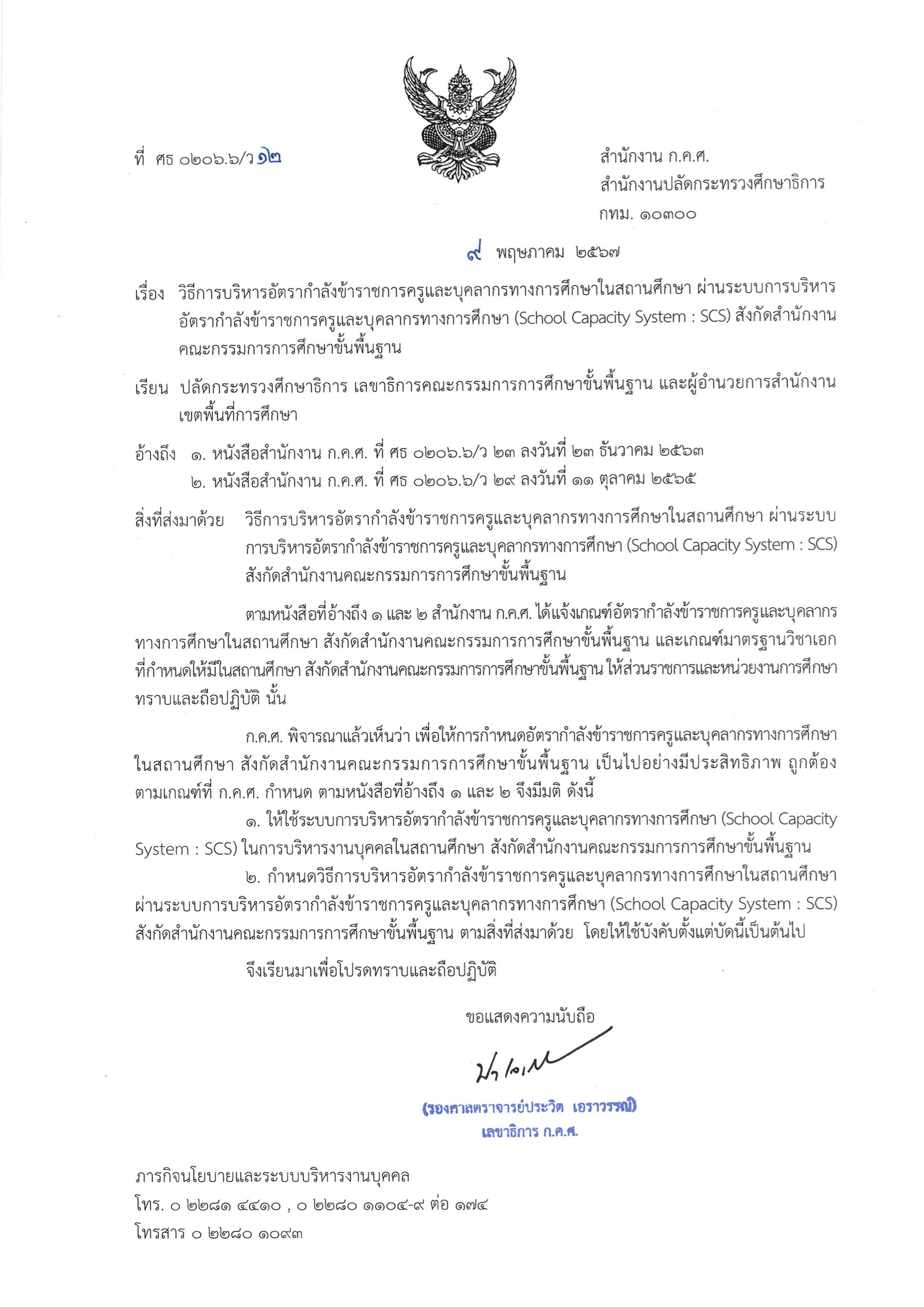 2.กำหนดวิธีการบริหารอัตรากำลังข้าราชการครูและบุคลากรทางการศึกษาในสถานศึกษา ผ่านระบบการบริหารอัตรากำลังข้าราชการครูและบุคลากรทางการศึกษา (School Capacity System:SCS) สังกัดสำนักงานคณะกรรมการการศึกษาขั้นพื้นฐาน โดยให้ใช้บังคับตั้งแต่บัดนี้เป็นต้นไป