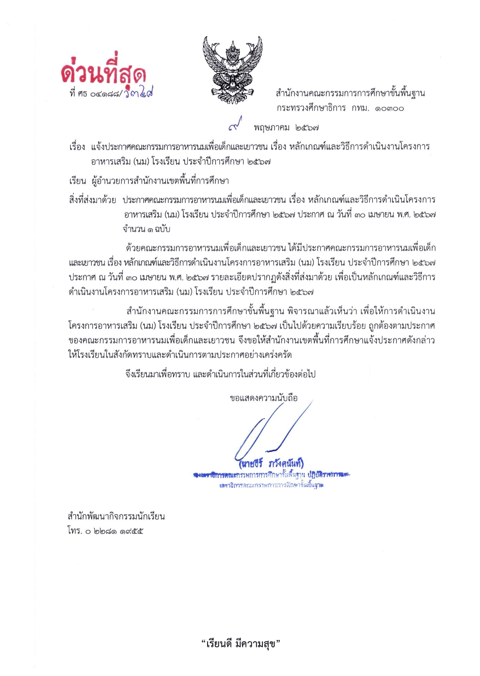 ด้วย คณะกรรมการอาหารนมเพื่อเด็กและเยาวชน ได้มีประกาศคณะกรรมการอาหารนมเพื่อเด็กและเยาวชน เรื่อง หลักเกณฑ์และวิธีการดำเนินงานโครงการอาหารเสริม นม) โรงเรียน ประจำปีการศึกษา 2567 ประกาศ ณ วันที่ 30 เมษายน พ.ศ.2567 รายละเอียดปรากฏดังสิ่งที่ส่งมาด้วย เพื่อเป็นหลักเกณฑ์และวิธีการดำเนินงานโครงการอาหารเสริม (นม)โรงเรียน ประจำปีการศึกษา 2567