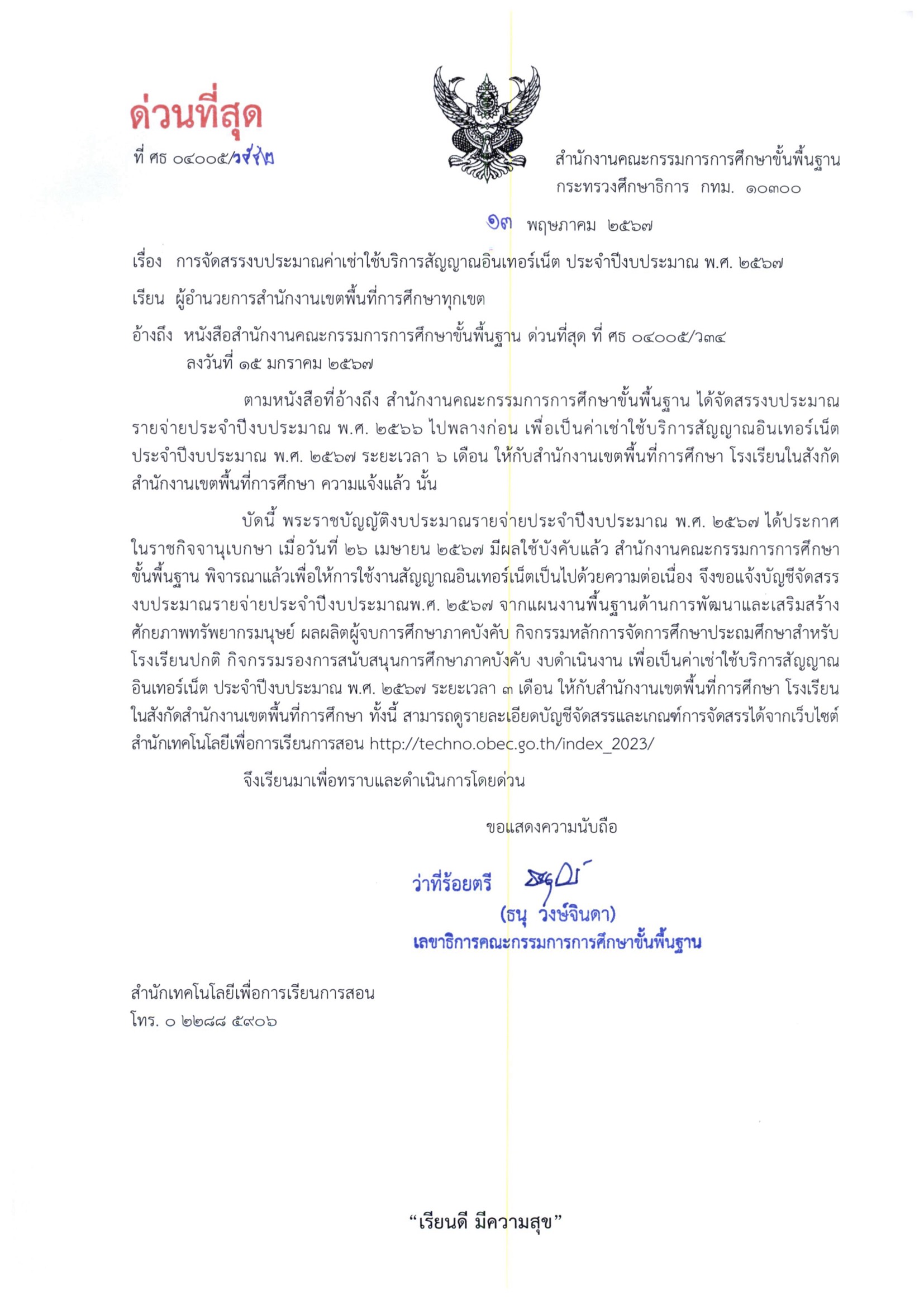 ตามที่ สำนักงานคณะกรรมการการศึกษาขั้นพื้นฐานได้จัดสรรงบประมาณรายจ่าย ประจำปีงบประมาณ พ.ศ.2566 ไปพลางก่อน เพื่อเป็นค่าเช่าใช้บริการสัญญาณอินเทอร์เน็ต ประจำปีงบประมาณ พ.ศ.2567 ระยะเวลา 6 เดือน ให้กับสำนักงานเขตพื้นที่การศึกษา โรงเรียนในสังกัดสำนักงานเขตพื้นที่การศึกษา ความแจ้งแล้วนั้น