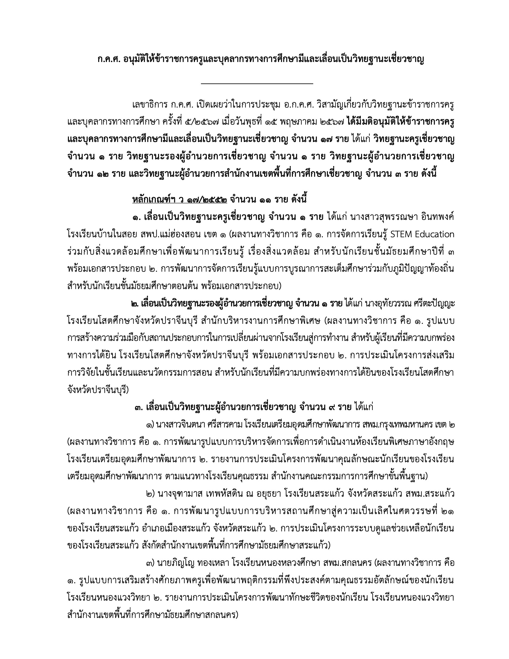 เลขาธิการ ก.ค.ศ.เปิดเผยว่าในการประชุม อ.ก.ค.ศ.วิสามัญเกี่ยวกับวิทยฐานะข้าราชการครูและบุคลากรทางการศึกษา ครั้งที่ 5/2567 เมื่อวันพุธที่ 15 พฤษภาคม 2567 ได้มีมติอนุมัติให้ข้าราชการครูและบุคลากรทางการศึกษา มีและเลื่อนเป็นวิทยฐานะเชี่ยวชาญจำนวน 17 ราย ได้แก่