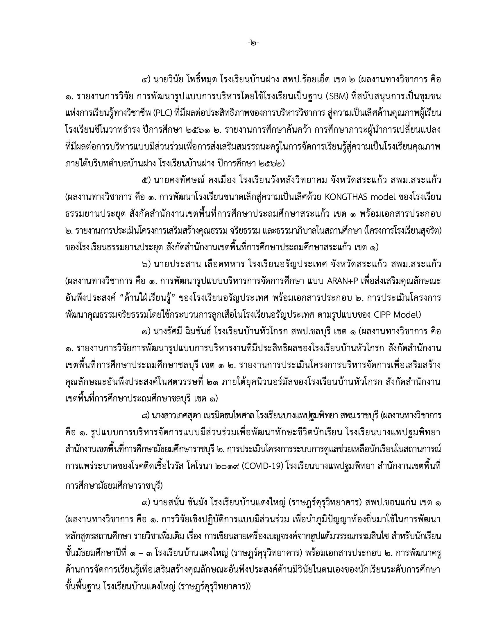 ๔) นายวินัย โพธิ์หมุด โรงเรียนบ้านฝาง สพป.ร้อยเอ็ด เขต ๒ (ผลงานทางวิชาการคือ ๑.รายงานการวิจัยการพัฒนารูปแบบการบริหารโดยใช้โรงเรียนเป็นฐาน (SBM) ที่สนับสนุนการเป็นชุมชนแห่งการเรียนรู้ทางวิชาชีพ (PLC) ที่มีผลต่อประสิทธิภาพของการบริหารวิชาการสู่ความเป็นเลิศด้านคุณภาพผู้เรียน โรงเรียนชิโนวาทธำรง ปีการศึกษา ๒๕๖๑ ๒.รายงานการศึกษาค้นคว้าการศึกษาภาวะผู้นำการเปลี่ยนแปลง ที่มีผลต่อการบริหารแบบมีส่วนร่วมเพื่อการส่งเสริมสมรรถนะครูในการจัดการเรียนรู้สู่ความเป็นโรงเรียนคุณภาพ ภายใต้บริบทตำบลบ้านฝาง โรงเรียนบ้านฝาง ปีการศึกษา ๒๕๖๒)