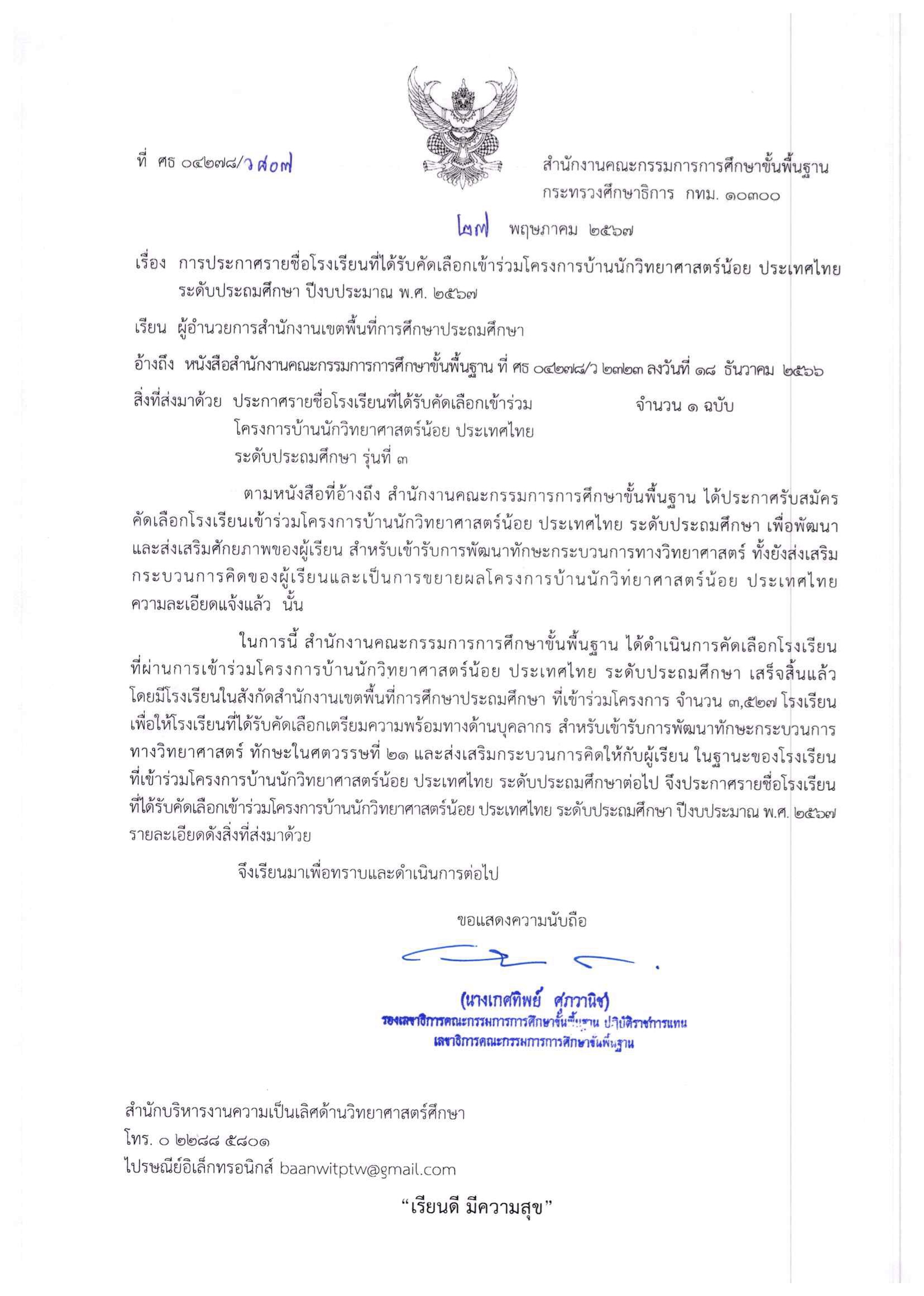 ในการนี้ สำนักงานคณะกรรมการการศึกษาขั้นพื้นฐาน ได้ดำเนินการคัดเลือกโรงเรียนที่ผ่านการเข้าร่วมโครงการบ้านนักวิทยาศาสตร์น้อยประเทศไทย ระดับประถมศึกษา เสร็จสิ้นแล้ว โดยมีโรงเรียนในสังกัดสำนักงานเขตพื้นที่การศึกษาประถมศึกษาที่เข้าร่วมโครงการจำนวน 3,527 โรงเรียน เพื่อให้โรงเรียนที่ได้รับคัดเลือก เตรียมความพร้อมทางด้านบุคลากรสำหรับเข้ารับการพัฒนาทักษะกระบวนการ ทางวิทยาศาสตร์ ทักษะในศตวรรษที่ 21 และส่งเสริมกระบวนการคิดให้กับผู้เรียน ในฐานะของโรงเรียนที่เข้าร่วมโครงการบ้านนักวิทยาศาสตร์น้อยประเทศไทย ระดับประถมศึกษาต่อไป จึงประกาศรายชื่อโรงเรียน ที่ได้รับคัดเลือกเข้าร่วมโครงการบ้านนักวิทยาศาสตร์น้อยประเทศไทยระดับประถมศึกษา ปีงบประมาณ พ.ศ.2567 รายละเอียดดังไฟล์แนบด้านล่าง