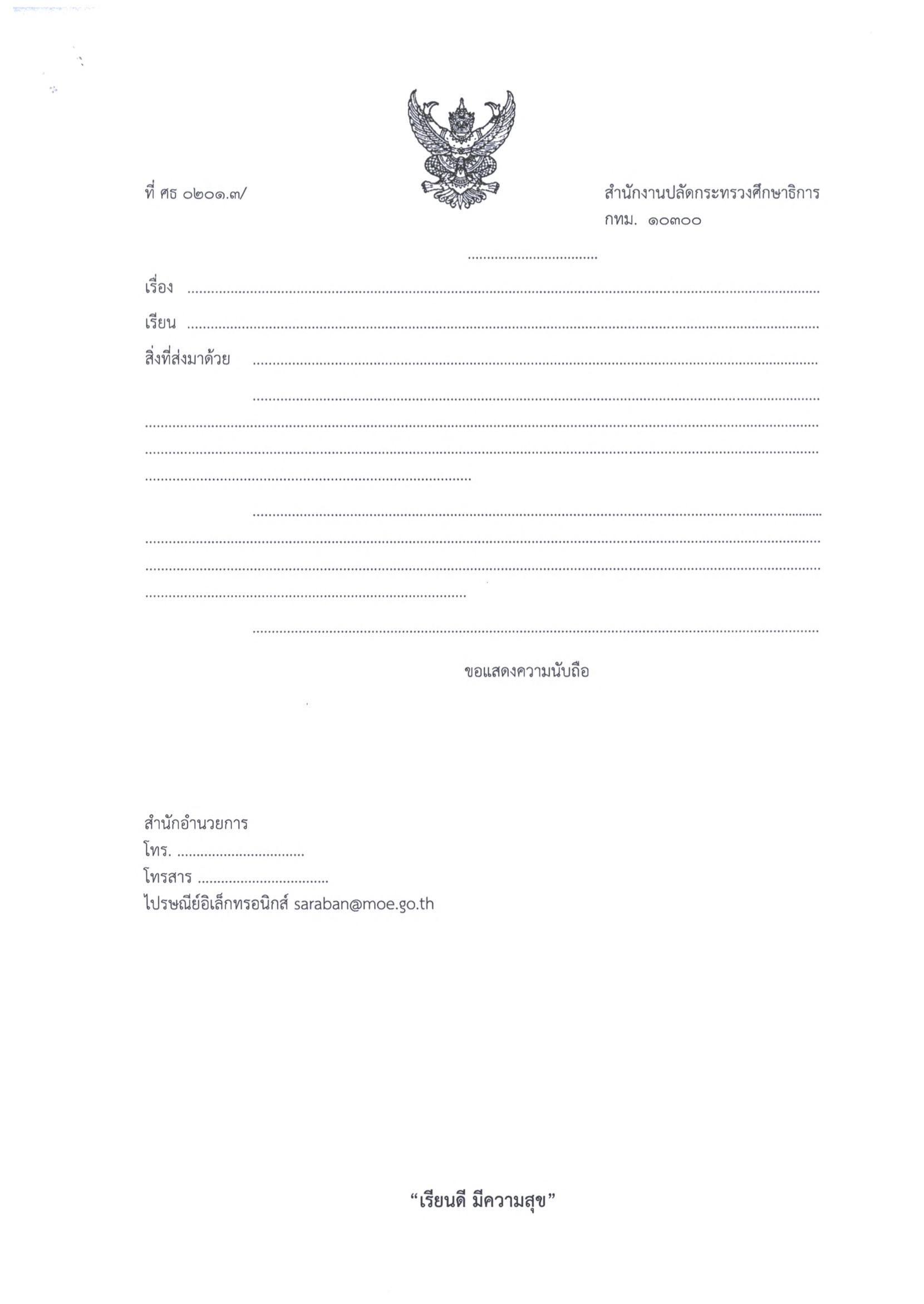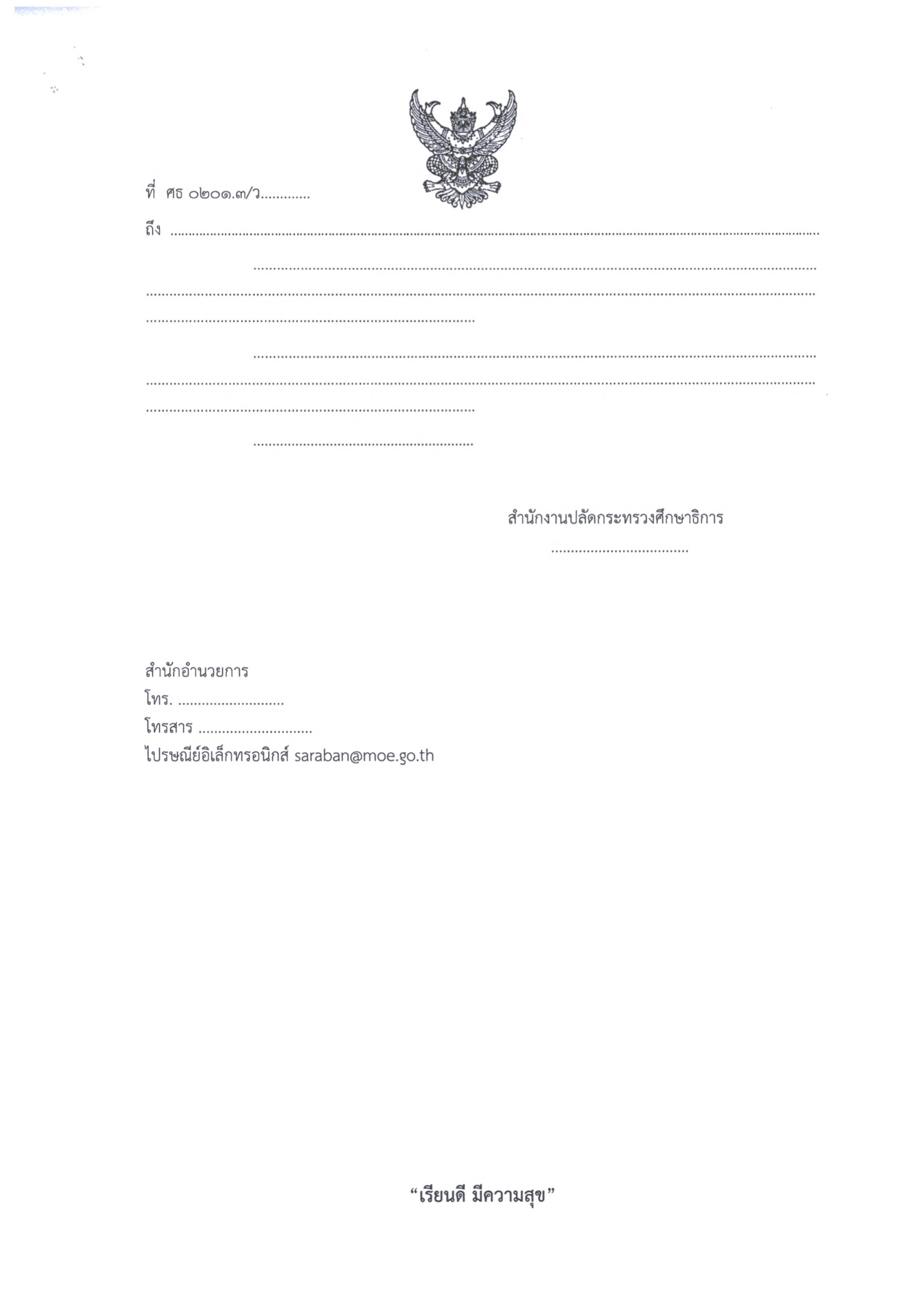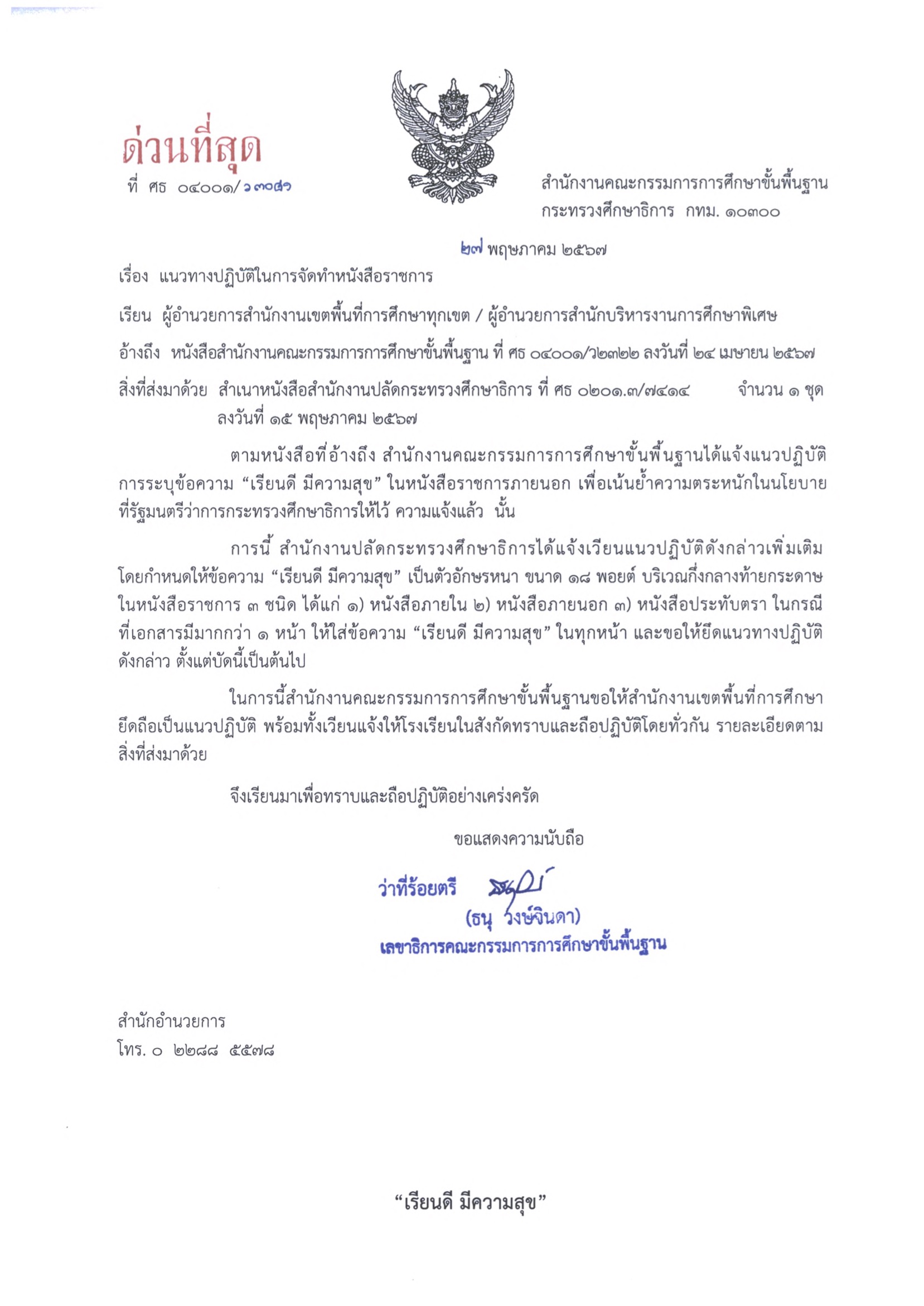 ในกรณีที่เอกสารมีมากกว่า 1 หน้า ให้ใส่ข้อความ "เรียนดี มีความสุข" ในทุกหน้า และขอให้ยืดแนวทางปฏิบัติ ดังกล่าวตั้งแต่บัดนี้เป็นต้นไป สำนักงานคณะกรรมการการศึกษาขั้นพื้นฐาน ขอให้สำนักงานเขตพื้นที่การศึกษายึดถือเป็นแนวปฏิบัติ พร้อมทั้งเวียนแจ้งให้โรงเรียนในสังกัดทราบและถือปฏิบัติโดยทั่วกัน