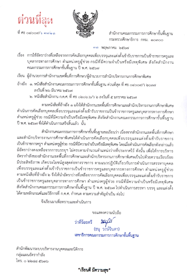 ด่วนที่สุดที่ ศธ 04009/3321 ลงวันที่ 31 พฤษภาคม 2567 เรื่อง การใช้อัตราว่างที่เหลือจากการคัดเลือกบุคคลเพื่อบรรจุและแต่งตั้งเข้ารับราชการเป็นข้าราชการครูและบุคลากรทางการศึกษา ตำแหน่งครูผู้ช่วย กรณีที่มีความจำเป็นหรือมีเหตุพิเศษ สังกัดสำนักงานคณะกรรมการการศึกษาขั้นพื้นฐาน ปี พ.ศ. 2567