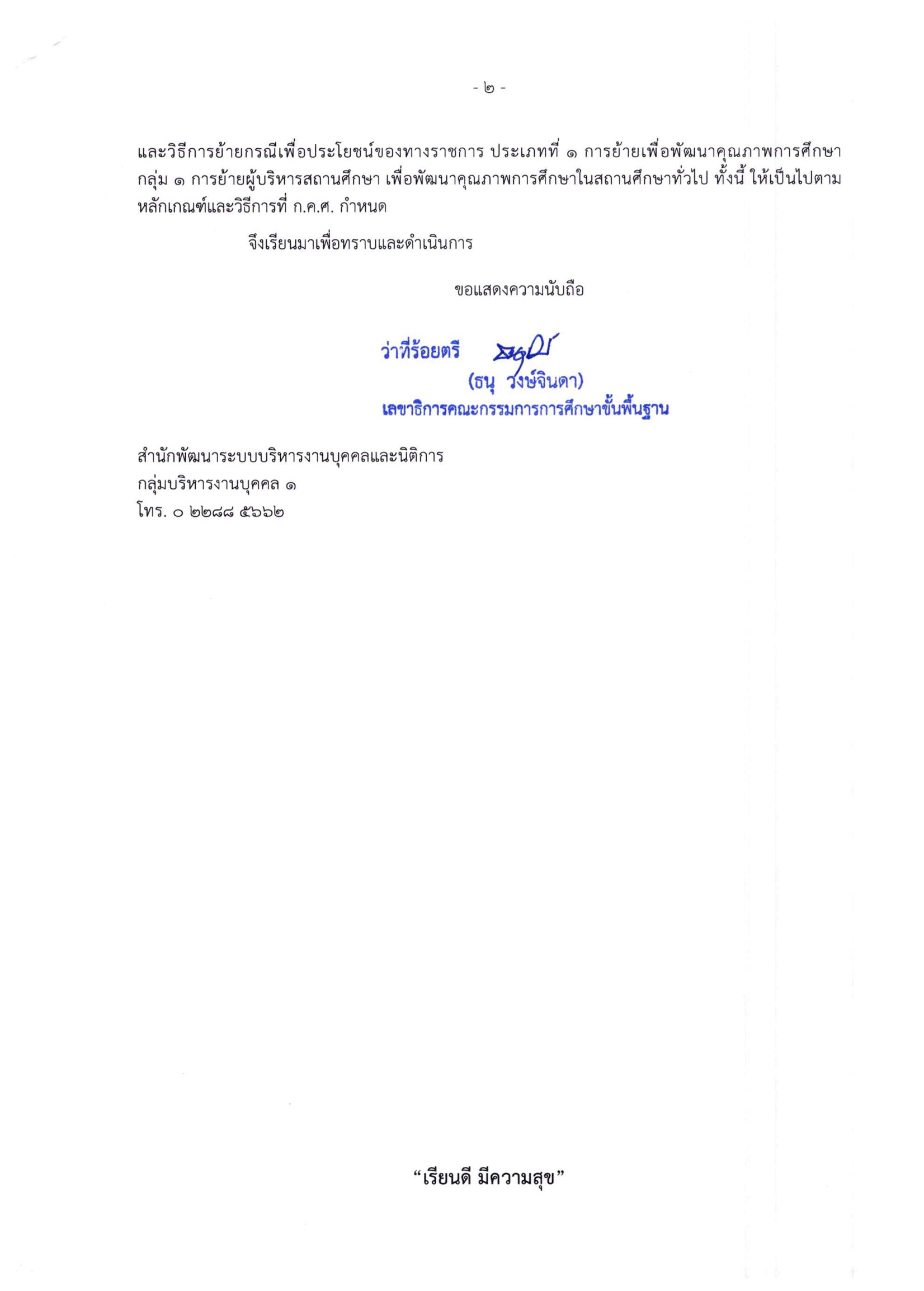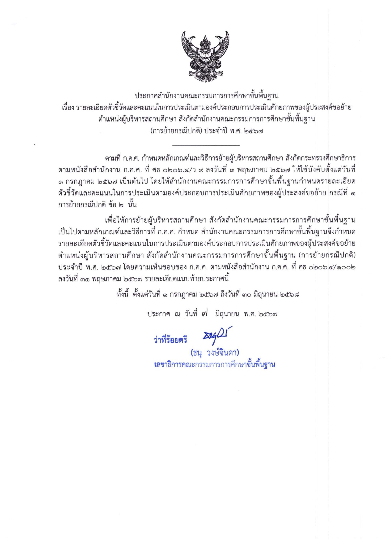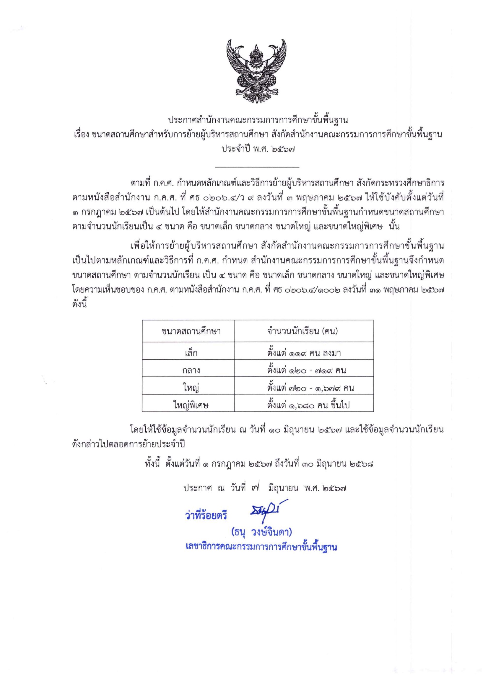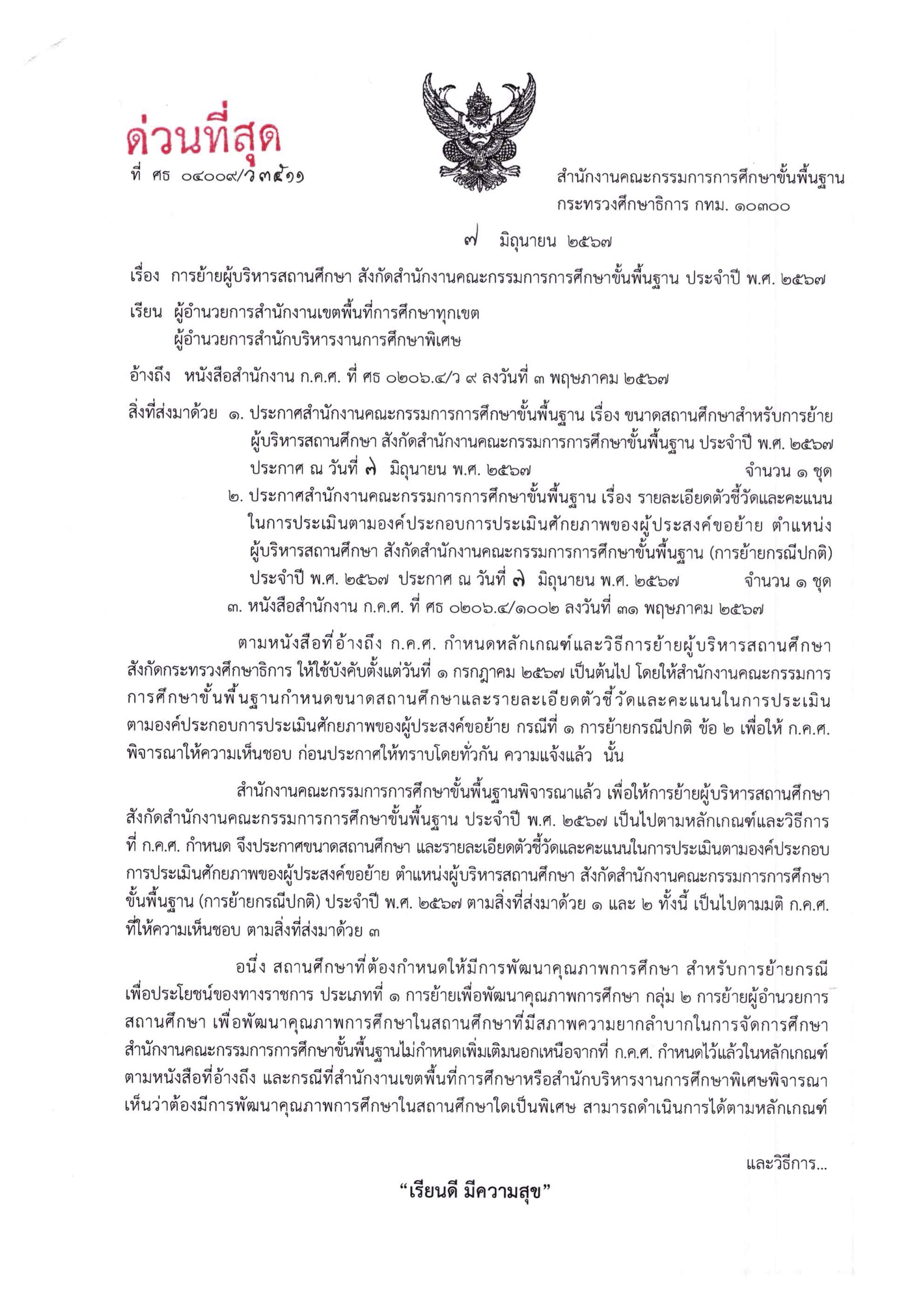 สำนักงานคณะกรรมการการศึกษาขั้นพื้นฐาน มีหนังสือที่ ศธ 04009/ว 3511 ลงวันที่ 7 มิถุนายน 2567 เรื่อง การย้ายผู้บริหารสถานศึกษา สังกัดสำนักงานคณะกรรมการการศึกษาขั้นพื้นฐาน ประจำปี พ.ศ. 2567