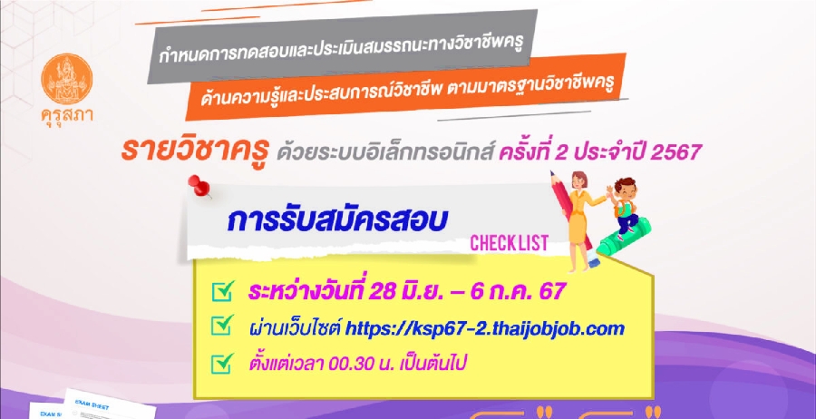 คุรุสภาเปิดรับสมัครการเข้ารับการทดสอบและประเมินสมรรถนะทางวิชาชีพครูฯ รายวิชาครู ด้วยระบบอิเล็กทรอนิกส์ ครั้งที่ 2 ประจำปี 2567 ระหว่างวันที่ 28 มิถุนายน – 6 กรกฎาคม 2567 ผ่านระบบออนไลน์ https://ksp67-2.thaijobjob.com