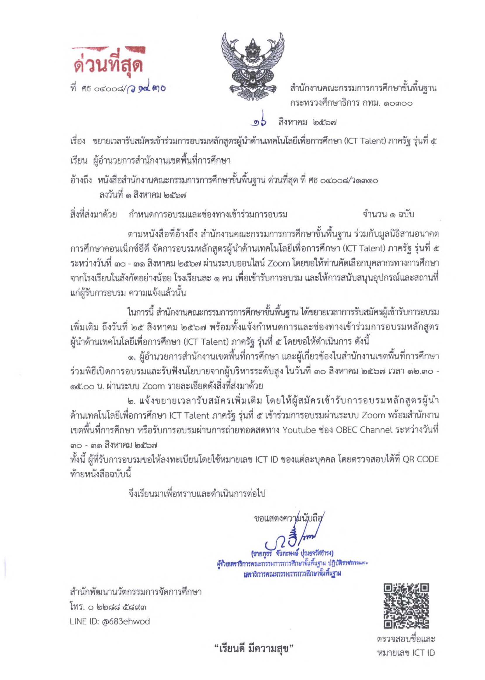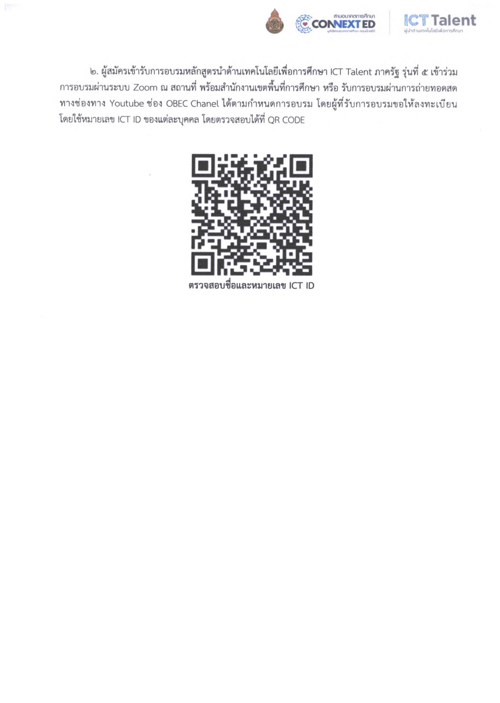 2.แจ้งขยายเวลารับสมัครเพิ่มเติม โดยให้ผู้สมัครเข้ารับการอบรมหลักสูตรผู้นำด้านเทคโนโลยีเพื่อการศึกษา ICT Talent ภาครัฐ รุ่นที่ 5 เข้าร่วมการอบรมผ่านระบบ Zoom พร้อมสำนักงานเขตพื้นที่การศึกษาหรือรับการอบรมผ่านการถ่ายทอดสดทาง Youtube ช่องOBEC Channel ระหว่างวันที่ 30-31 สิงหาคม 2567 ทั้งนี้ ผู้ที่รับการอบรมขอให้ลงทะเบียนโดยใช้หมายเลข ICT ID ของแต่ละบุคคล โดยตรวจสอบได้ที่ QR CODE ท้ายหนังสือฉบับนี้