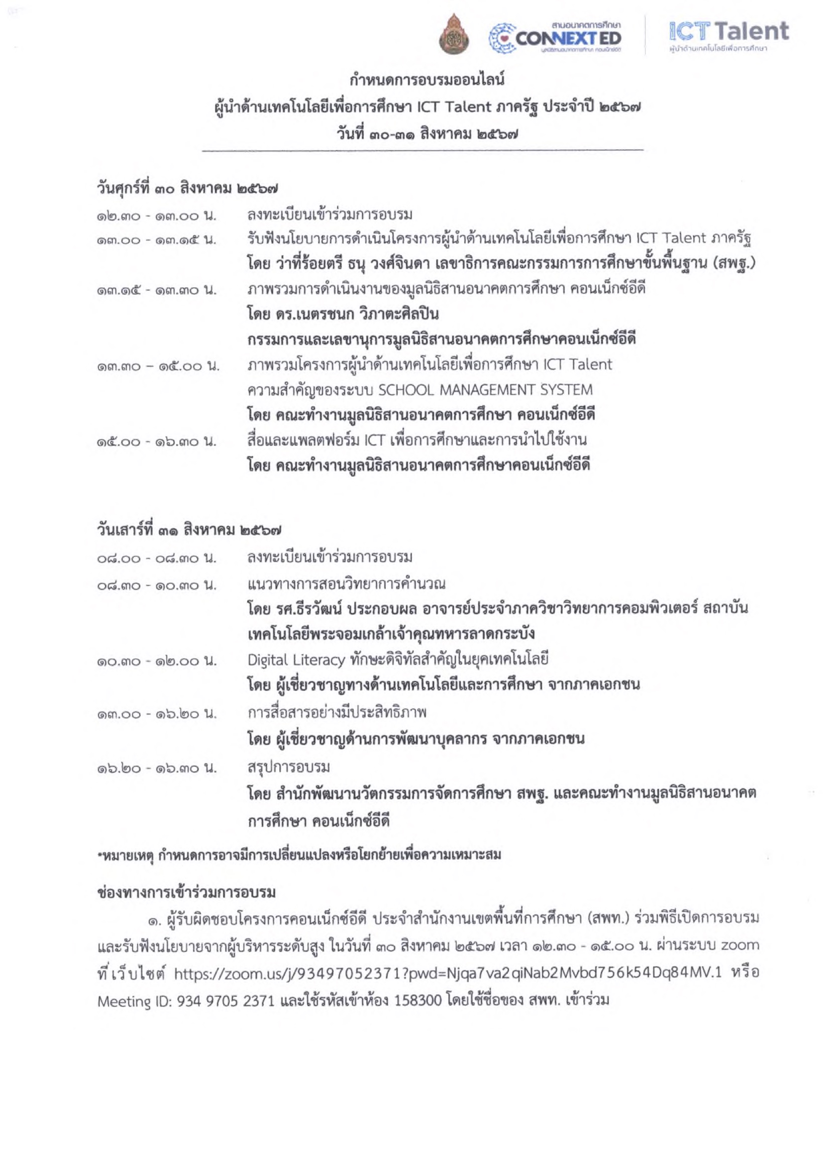 ตามหนังสือที่อ้างถึง สำนักงานคณะกรรมการการศึกษาขั้นพื้นฐาน ร่วมกับมูลนิธิสานอนาคตการศึกษาคอนเน็กซ์อีดี จัดการอบรมหลักสูตรผู้นำด้านเทคโนโลยีเพื่อการศึกษา (ICT Talent) ภาครัฐ รุ่นที่ 5 ระหว่างวันที่ 30-31 สิงหาคม 2567 ผ่านระบบออนไลน์ Zoom โดยขอให้ท่านคัดเลือกบุคลากรทางการศึกษาจากโรงเรียนในสังกัด อย่างน้อยโรงเรียนละ 1 คน เพื่อเข้ารับการอบรมและให้การสนับสนุนอุปกรณ์และสถานที่แก่ผู้รับการอบรม ความแจ้งแล้วนั้น