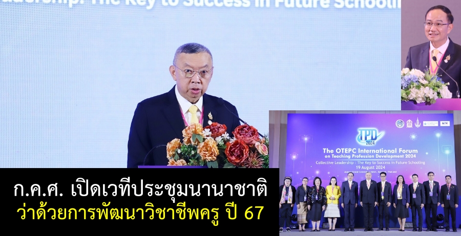 เมื่อเร็วๆ นี้ สำนักงานคณะกรรมการข้าราชการครูและบุคลากรทางการศึกษา (ก.ค.ศ.) ได้จัดการประชุมนานาชาติว่าด้วยการพัฒนาวิชาชีพครู ประจำปี พ.ศ.2567 (The OTEPC International Forum on Teaching Profession Development 2024) ภาวะผู้นำร่วม : กุญแจสู่ความสำเร็จในการจัดการเรียนรู้แห่งอนาคต (Collective Leadership: The Key to Success in Future Schooling) โดยมี พล.ต.อ.เพิ่มพูน ชิดชอบ รัฐมนตรีว่าการกระทรวงศึกษาธิการ เป็นประธานในพิธีเปิดงาน ณ โรงแรมอัศวิน แกรนด์ คอนเวนชั่น กรุงเทพมหานคร