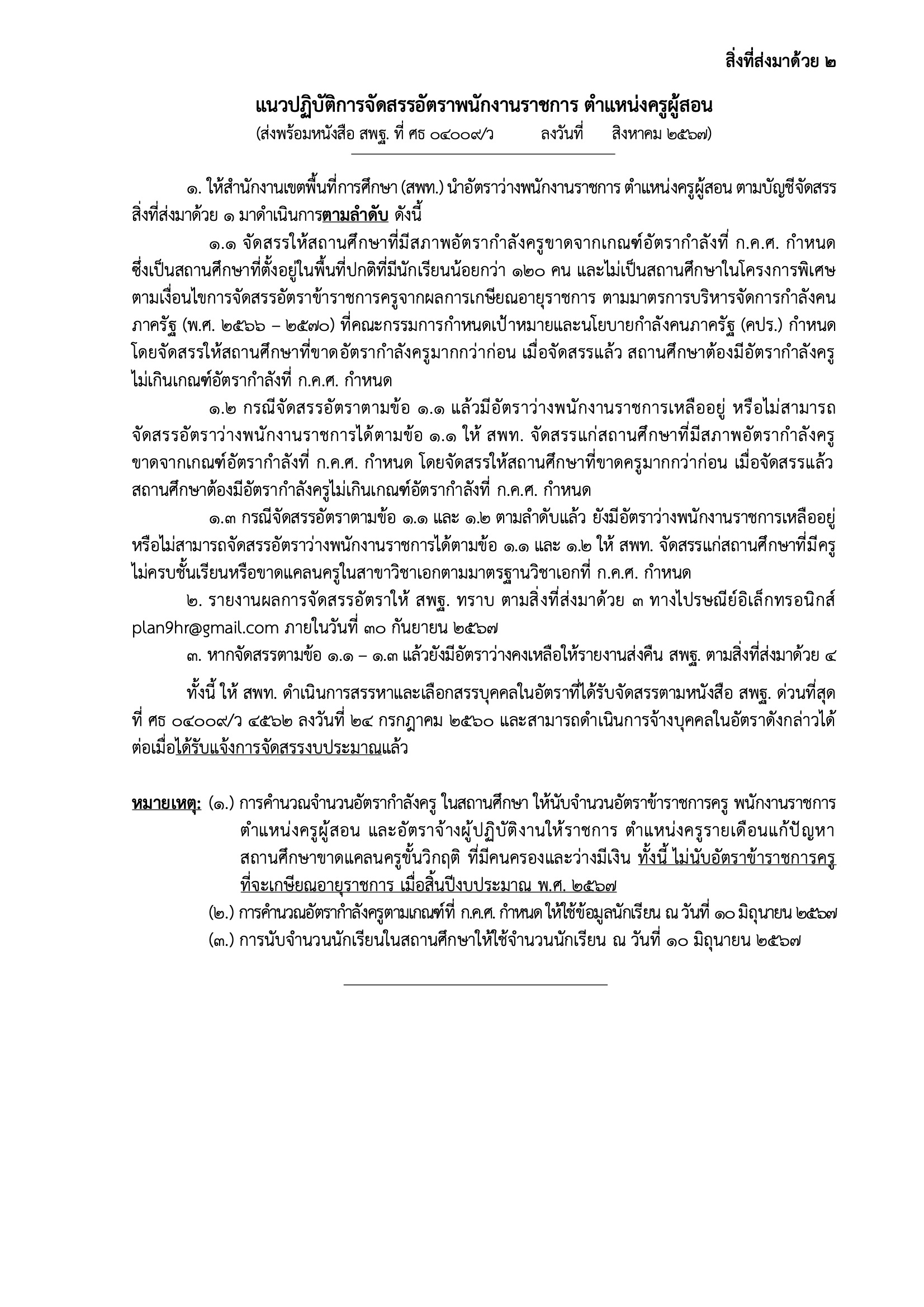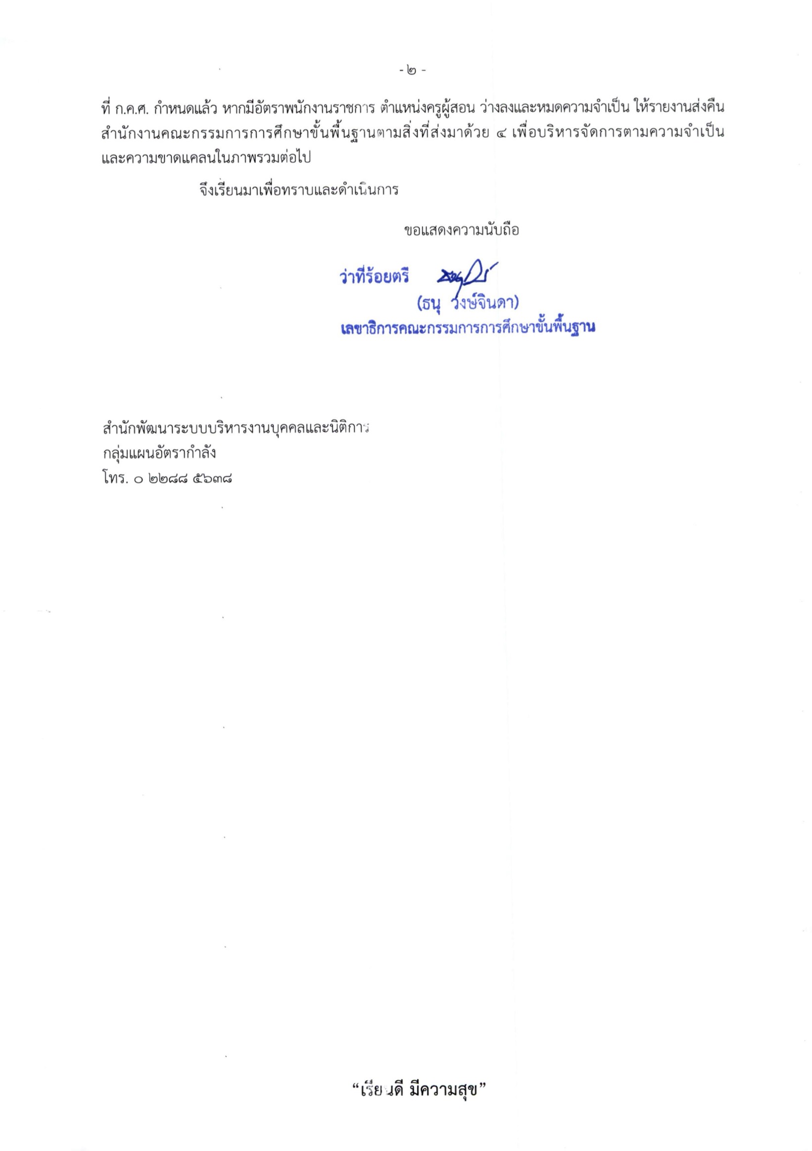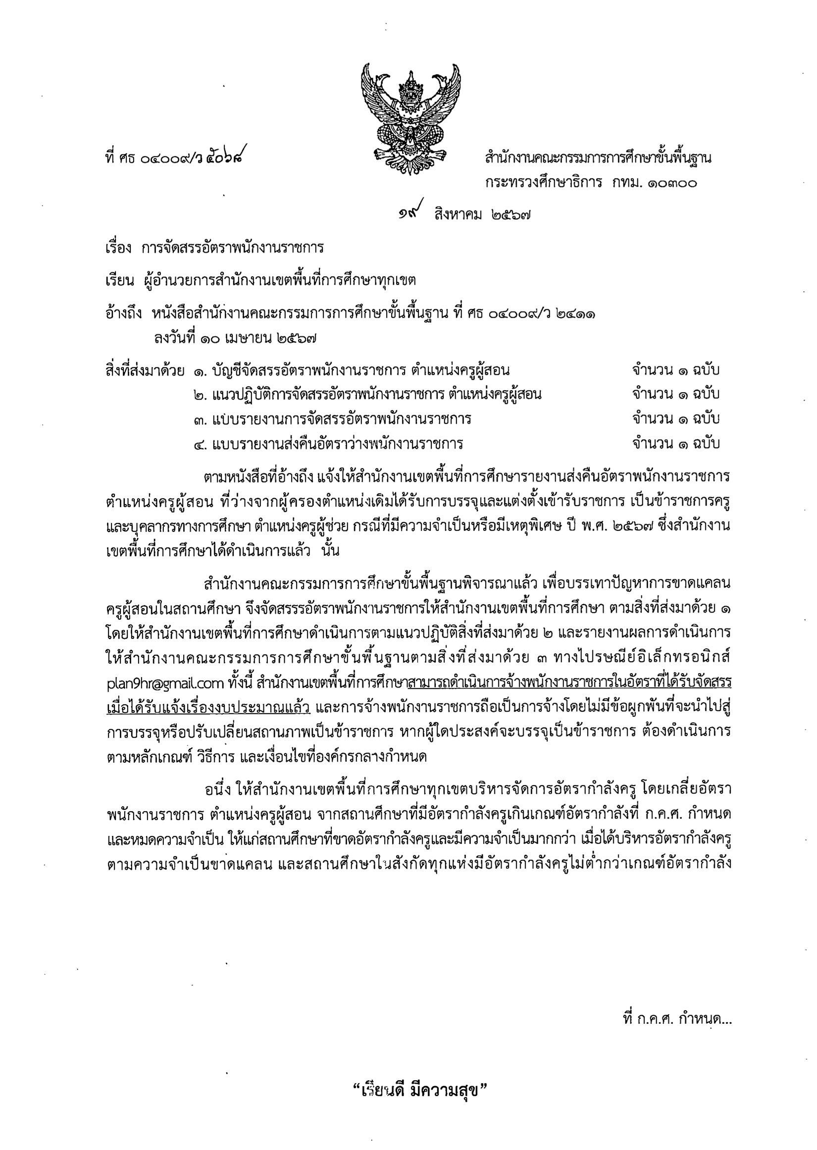 สำนักงานคณะกรรมการการศึกษาขั้นพื้นฐาน มีหนังสือที่ ศธ 04009/ว 5068 ลงวันที่ 19 สิงหาคม 2567 เรื่อง การจัดสรรอัตราพนักงานราชการ