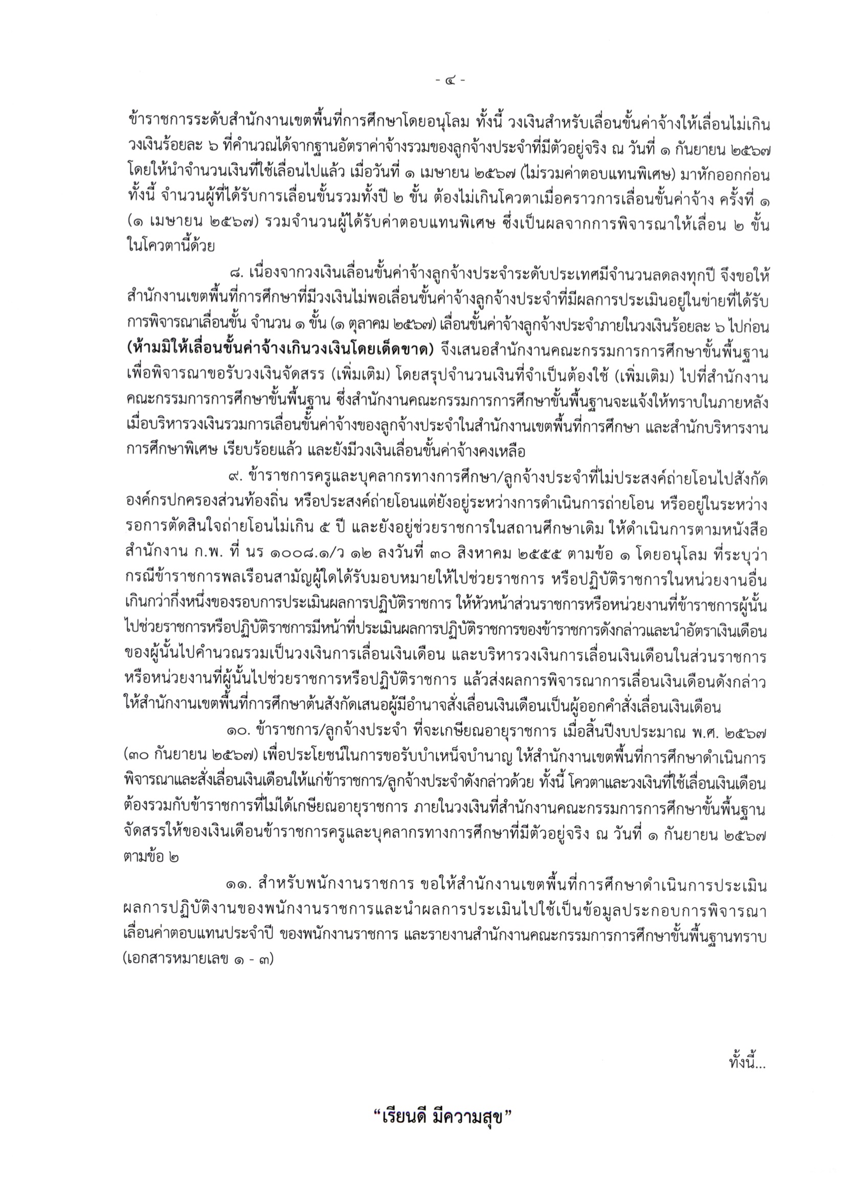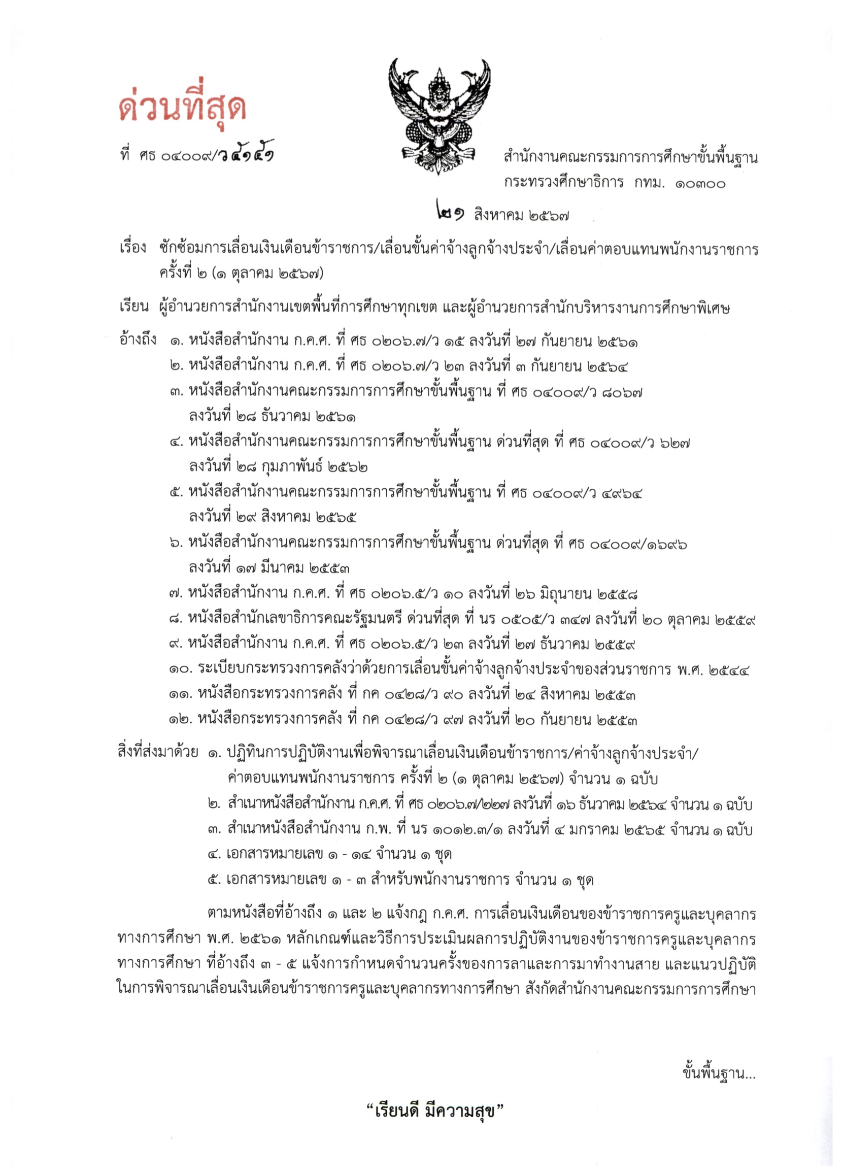 สำนักงานคณะกรรมการการศึกษาขั้นพื้นฐาน ขอให้สำนักงานเขตพื้นที่การศึกษาทุกเขต/สำนักบริหารงานการศึกษาพิเศษ ดำเนินการเลื่อนเงินเดือนข้าราชการและเลื่อนขั้นค่าจ้างลูกจ้างประจำในสังกัด ในวันที่ 1 ตุลาคม 2567 โดยถือปฏิบัติตามกฎ ก.ค.ศ. การเลื่อนเงินเดือนของข้าราชการครูและบุคลากรทางการศึกษา พ.ศ. 2561 หลักเกณฑ์และวิธีการประเมินผลการปฏิบัติงานของข้าราชการครูและบุคลากรทางการศึกษา แนวปฏิบัติในการพิจารณาเลื่อนเงินเดือนข้าราชการครูและบุคลากรทางการศึกษา สังกัดสำนักงานคณะกรรมการการศึกษาขั้นพื้นฐาน พ.ศ. 2562 ฯลฯ และขอแจ้งแนวปฏิบัติเพิ่มเติมมาพร้อมหนังสือฉบับนี้ โดยเมื่อดำเนินการเสร็จเรียบร้อยแล้ว ให้รายงานข้อมูลตามกำหนดเวลาในปฏิทินการปฏิบัติงาน